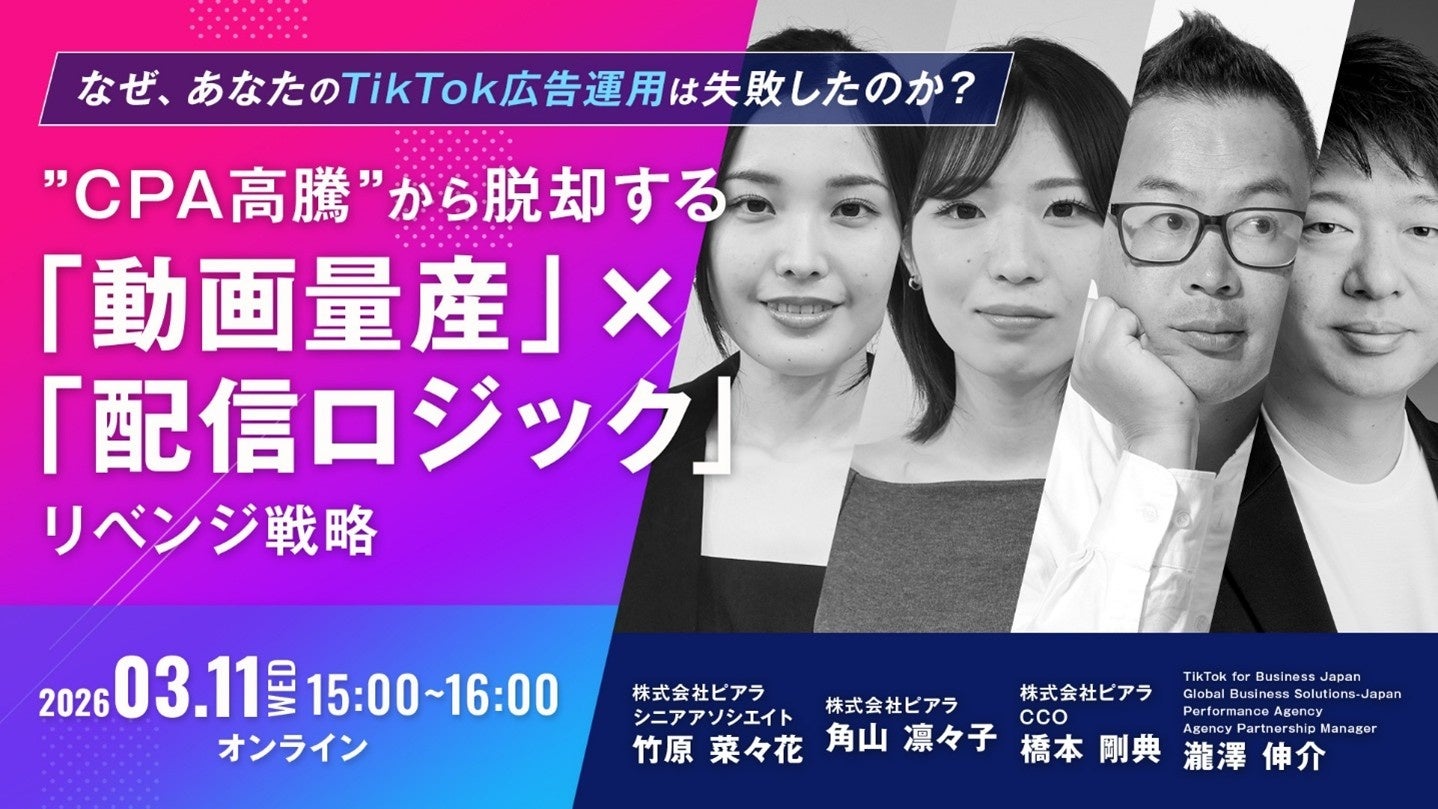 当社は2026年3月11日(水)にTikTok広告を活用した新規ユーザーの獲得にご興味のある経営者・役員・役職者・マーケティングご担当者を対象とした無料オンラインセミナーを開催いたします。