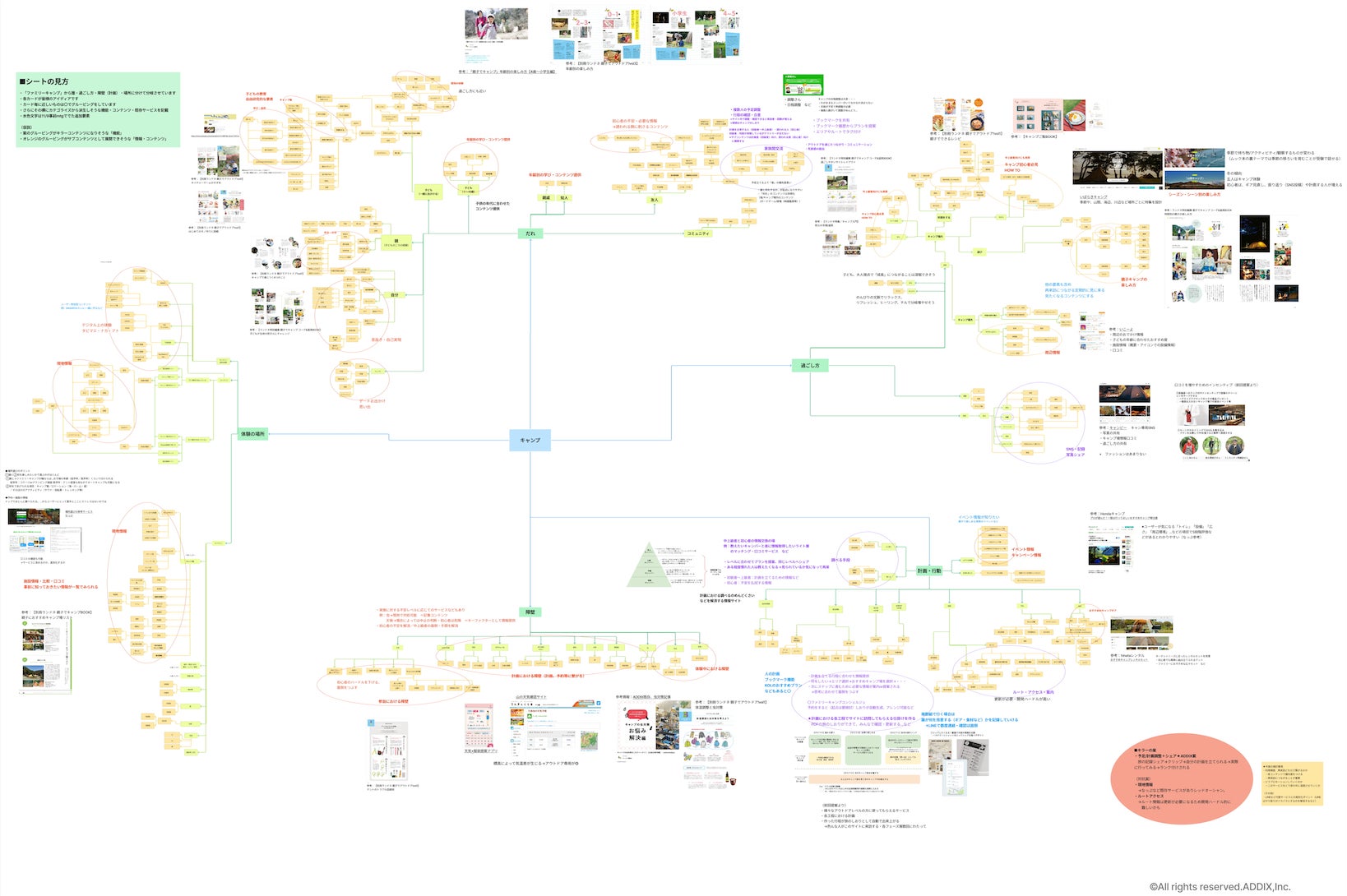 初期段階のターゲット設計では、自動車ユーザーが多いキャンパーに注目し、キャンパーに使われるサービスを用意することを策定。損害保険ジャパンのメンバーとマインドマップを作成しながらアイデアブレストを重ね、キャンパーのインサイトからキャンプの計画、キャンプへの仲間を招待、キャンプでの思い出をストック・仲間と共有できるキラーコンテンツを企画しました。