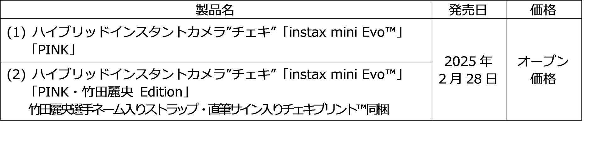 富士フイルム株式会社(本社:東京都港区、代表取締役社長・CEO:後藤 禎一)は、instax™ “チェキ”のハイブリッドインスタントカメラ「instax(インスタックス) mini(ミニ) Evo(エヴォ)™」(以下「mini Evo」) の特別カラー「PINK」を日本国内・数量限定で2025年2月28日に発売(※1)します。