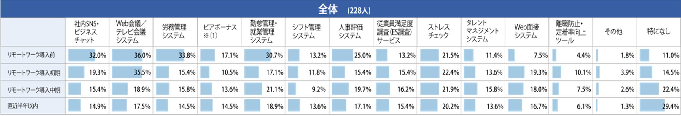 「社内SNS・ビジネスチャット」「勤怠管理・就業管理システム」の導入率が高かった。