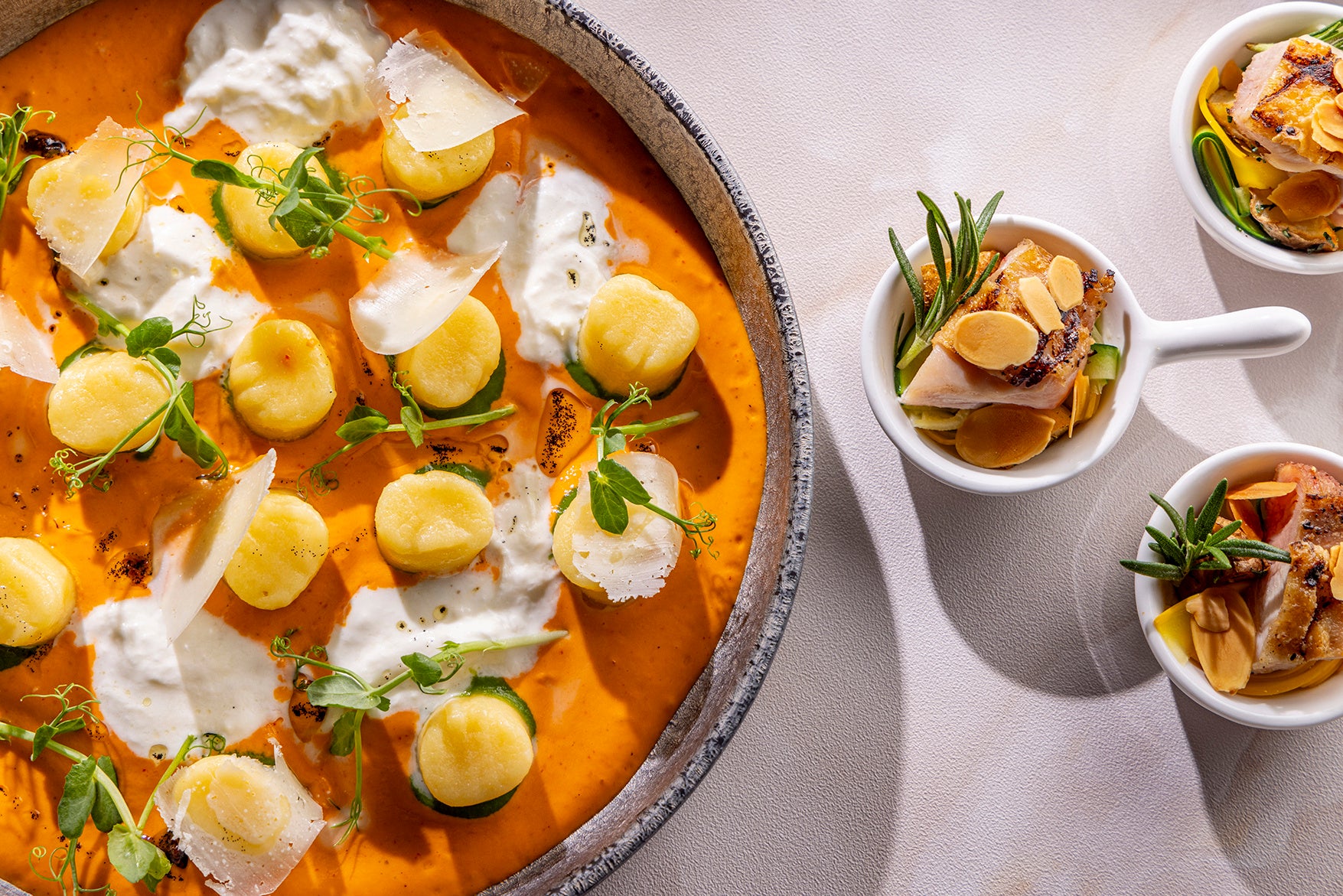 ポテトニョッキ ストラッチャテッラチーズとジェノベーゼ ローストした赤パプリカソース