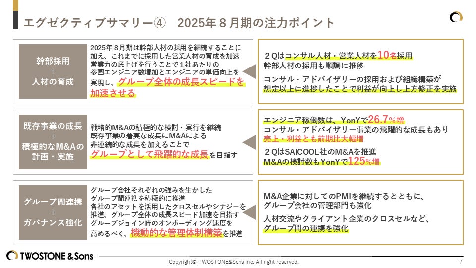 2025年8月期は「幹部採用と人材の育成」「既存事業の成長と積極的なM&Aの計画・実施」「グループ間連携とガバナンス強化」の3点を注力ポイントとしております。
