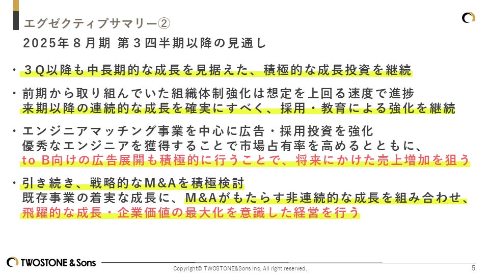 エンジニアマッチング事業を中心に、採用・広告投資の強化を計画しております。優秀なエンジニアを獲得することで市場占有率を高めるとともに、法人向けの広告展開も積極的に行うことで、将来にかけた売上増加を狙ってまいります。