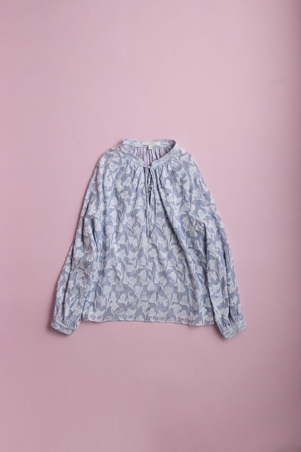 爽やかなストライプの上に、花々が浮かび上がるようなカットジャカードを施しました。首元のボウタイは、ラフに垂らしたり、リボン結びにしたり、表情の変化を愉しめる仕様です。フェミニンなスカートスタイルにはもちろんのこと、ウォッシュ加工が施された淡いブルーのデニムパンツや、ゆったりしたチノパンツなどを合わせた気軽なスタイルに取り入れていただくのもお薦めです。