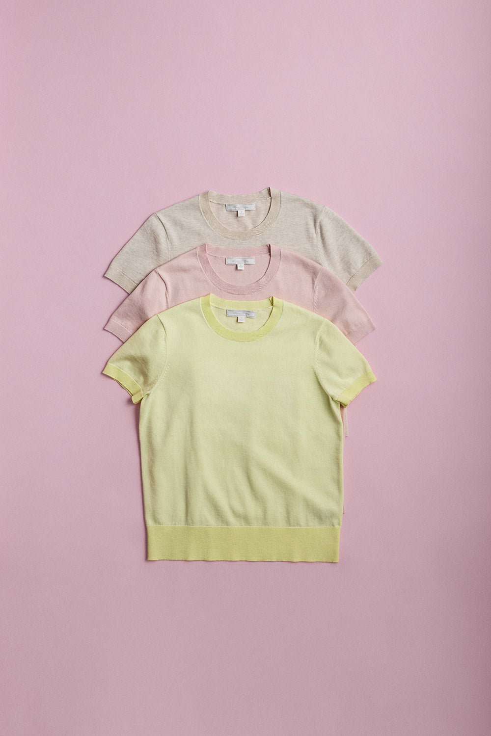 春夏のコーディネートに活躍するシンプルなショートスリーブセーター。スーピマコットンならではの艶のある滑らかな質感と心地よい肌触り、美しい発色が、日々のスタイリングをさりげなく格上げします。単品ではもちろん同生地を使用したカーディガンと合わせて、アンサンブルとしての着用もおすすめです。