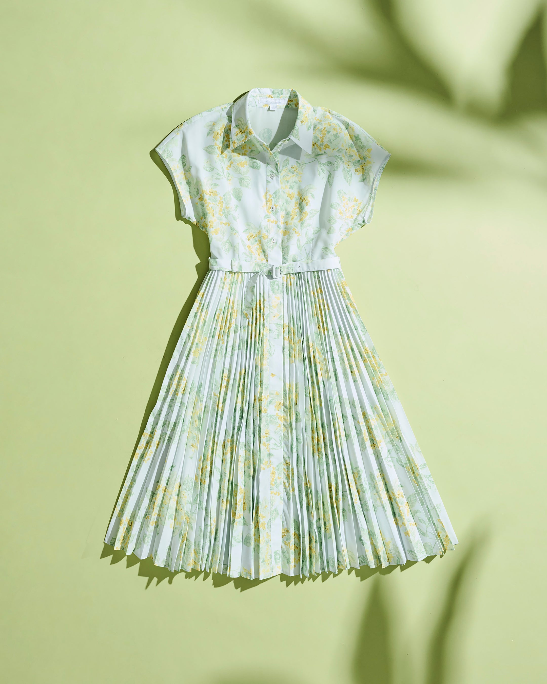 歩くたびに揺れる繊細なプリーツと水彩画のような草花のプリントが、春夏の装いをドラマチックに昇華させます。肩先を覆うフレンチスリーブと、ウエストの共布ベルトが、シルエットを美しく整え、一枚で完成されたスタイリングを叶えます。ガーデンパーティーや、カフェのテラス席でくつろぐひと時にもぴったりなドレスです。