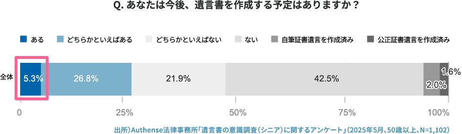 「あなたは今後、遺言書を作成する予定はありますか?」との問いに対し、明確に「ある」と回答したのは5.3%にとどまり、約20人に1人の割合。作成に至るまでには大きな心理的ハードルが存在していることがわかります。