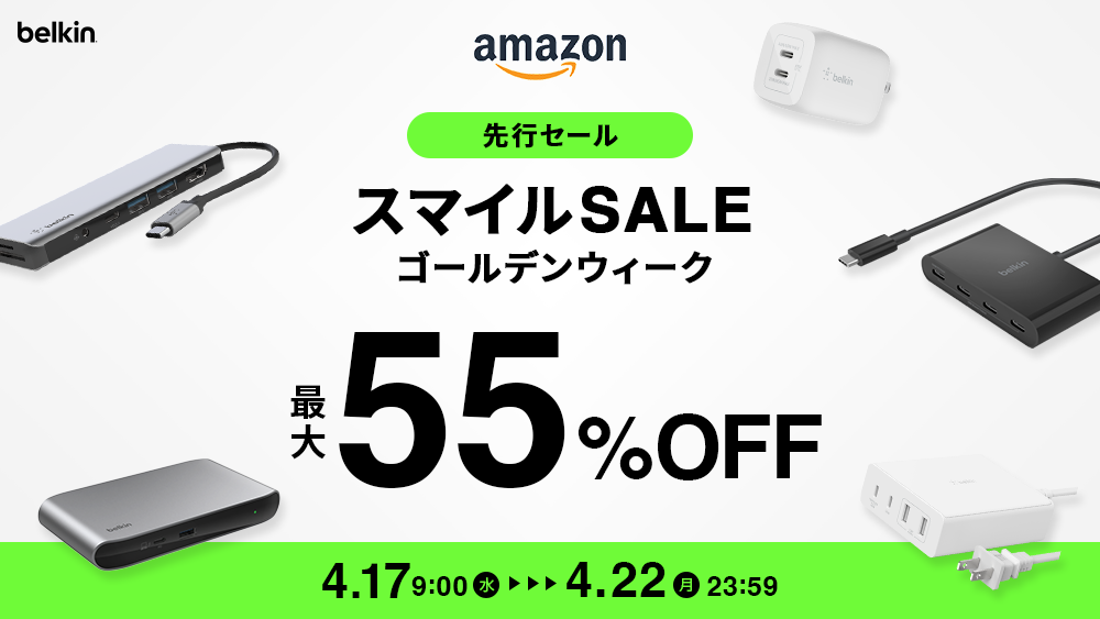 米カリフォルニア発、洗練されたデザインと快適なライフスタイル体験を提案し、グローバルで絶大な人気と市場シェアを誇るスマートフォン・PC関連製品ブランド「Belkin」の日本法人、ベルキン株式会社(以下Belkin、所在地:東京都中央区京橋)は、Amazon.co.jpで4月17日~22日に開催されるAmazon スマイル SALE先行セールで134製品が最大55%オフで販売いたします。本セールは4月19日~22日に開催されます。