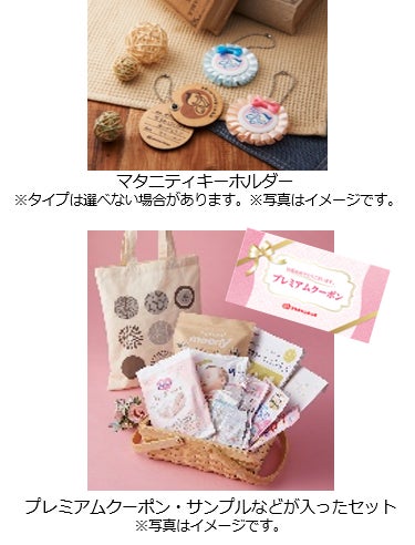 また、出産予定日をご登録いただいたお客さまには、サンプルなどが入ったセット&マタニティキーホルダー、対象商品がお得にお求めいただけるプレミアムクーポンをプレゼントいたします。