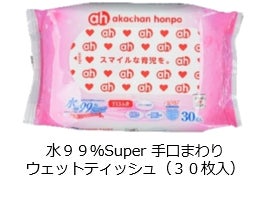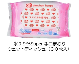 オープン記念特典として、セール期間中お買上げいただいた方に「水99%Super 手口まわりウェットティッシュ(30枚入)」をプレゼントします。(各日先着200名様限定※1家族様1点限り)
