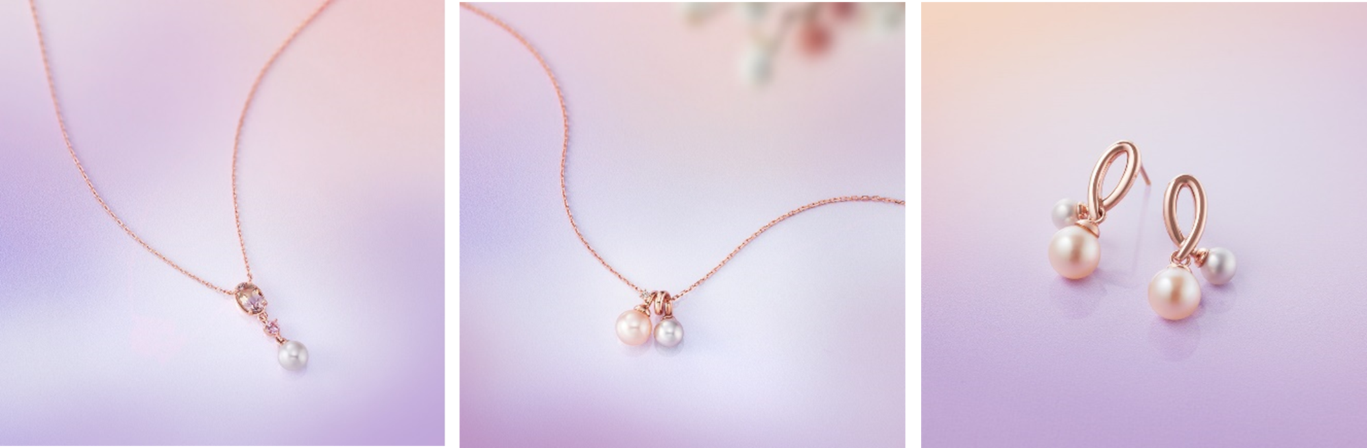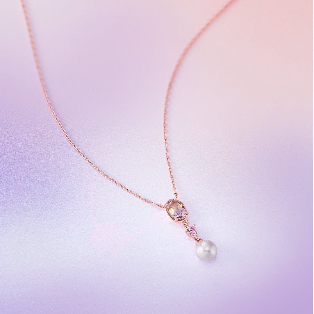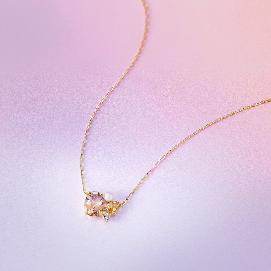 光を受けることでパープルからイエローへと淡く儚げに溶け込むアメトリンの表情に、グレーカラーのパールのモダンな輝きをプラスしたネックレスも。ピンクとグレーのパールをピンクゴールドの穏やかなカラーの地金で繋いだ木の実モチーフは、優しく温かみのある秋の色彩を織りなします。