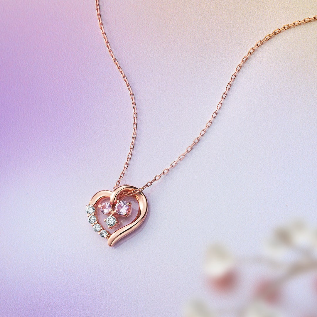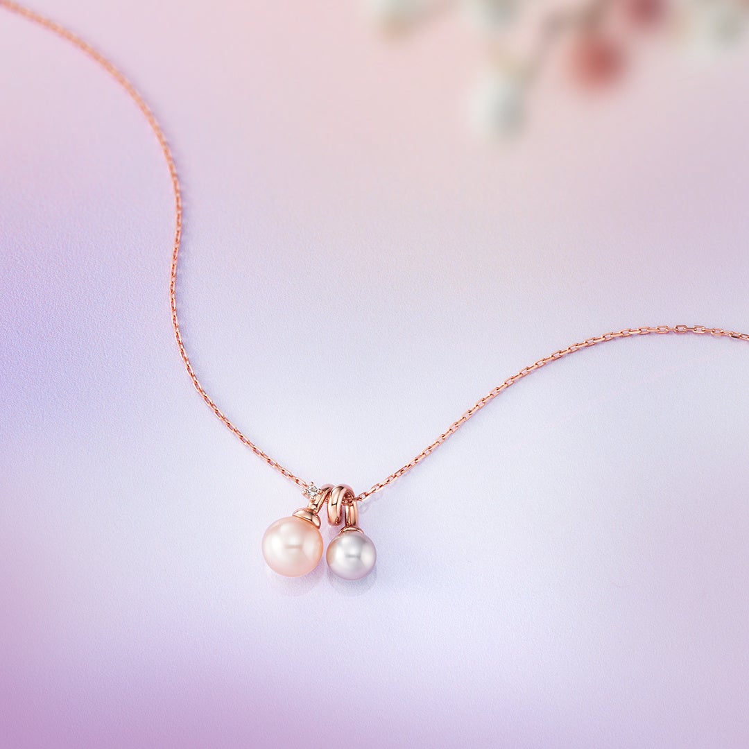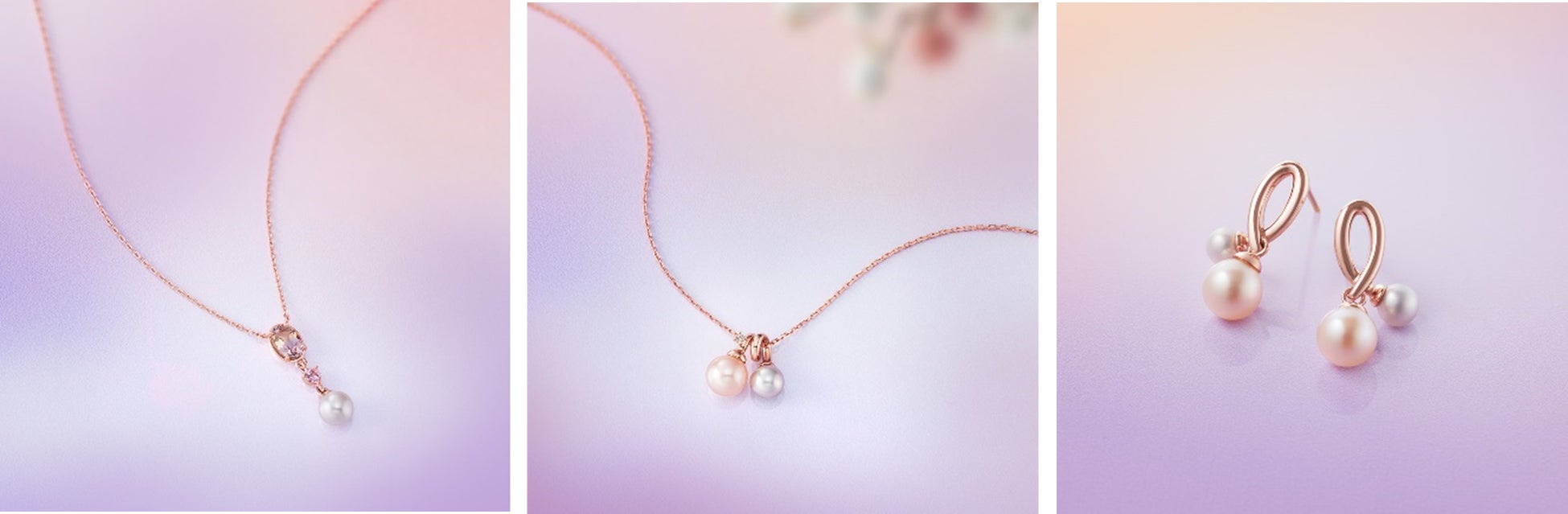 光を受けることでパープルからイエローへと淡く儚げに溶け込むアメトリンの表情に、グレーカラーのパールのモダンな輝きをプラスしたネックレスも。ピンクとグレーのパールをピンクゴールドの穏やかなカラーの地金で繋いだ木の実モチーフは、優しく温かみのある秋の色彩を織りなします。