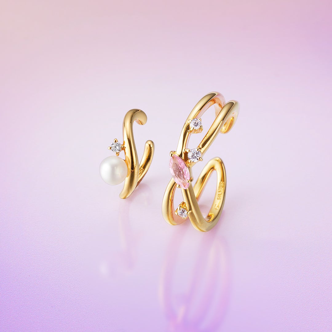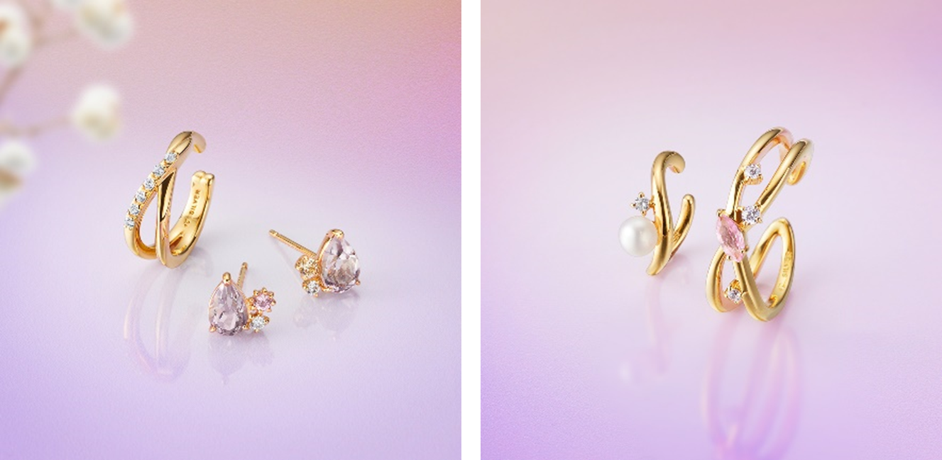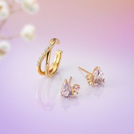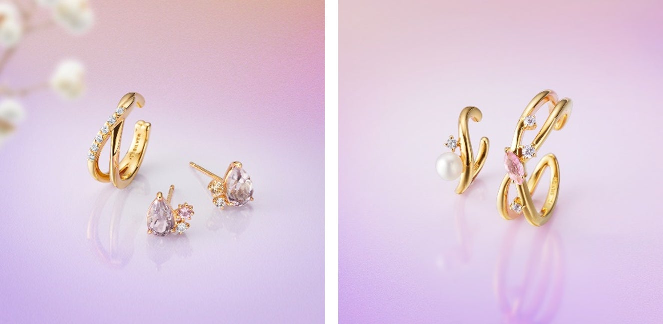 華やかなアクセントが魅力の耳周りジュエリーのセットも登場。ストーンを寄せたピアスは、目を惹くアメトリンのグラデーションにピンクサファイアが煌めきを放つ、程よい存在感が魅力です。そよ風のようなウェーブラインの上に木の実をイメージしたパールがしなやかに寄り添うカフリングも。上品な色合いと程よい輝きが、身に着ける人の横顔を魅力的に彩ります。