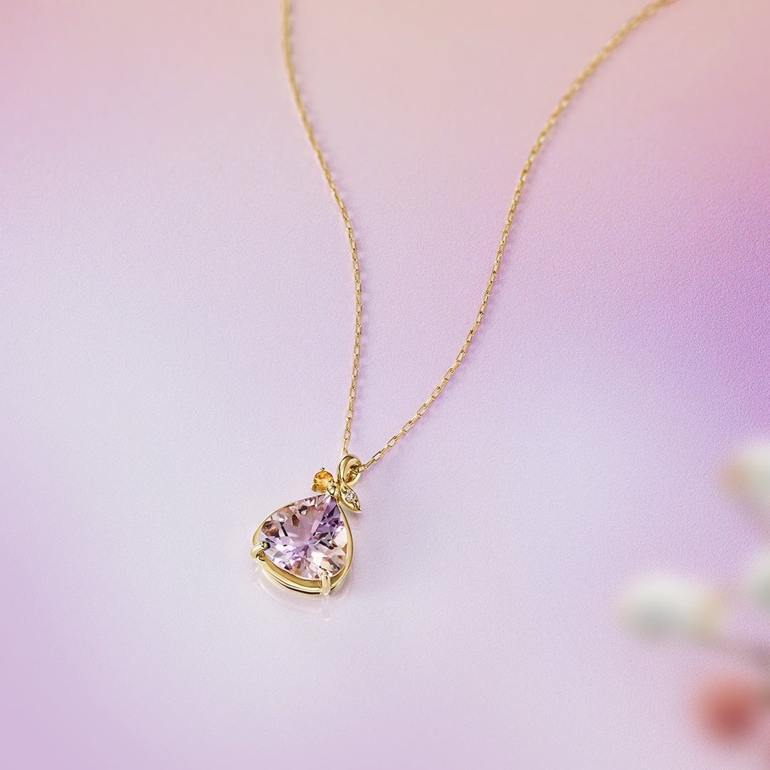 秋の実りをイメージしたマロンカットのアメトリンが幻想的な大人の魅力を放つネックレスやピアスは、K18イエローゴールドの深みのある色合いと調和します。