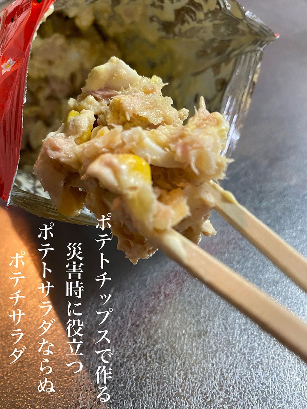 ポテトチップスを使用したアイディアレシピです。袋の中に、缶詰と調味料を入れて揉むだけの簡単調理で、調理器具がなくてもある食材だけで作る工夫がされていました。