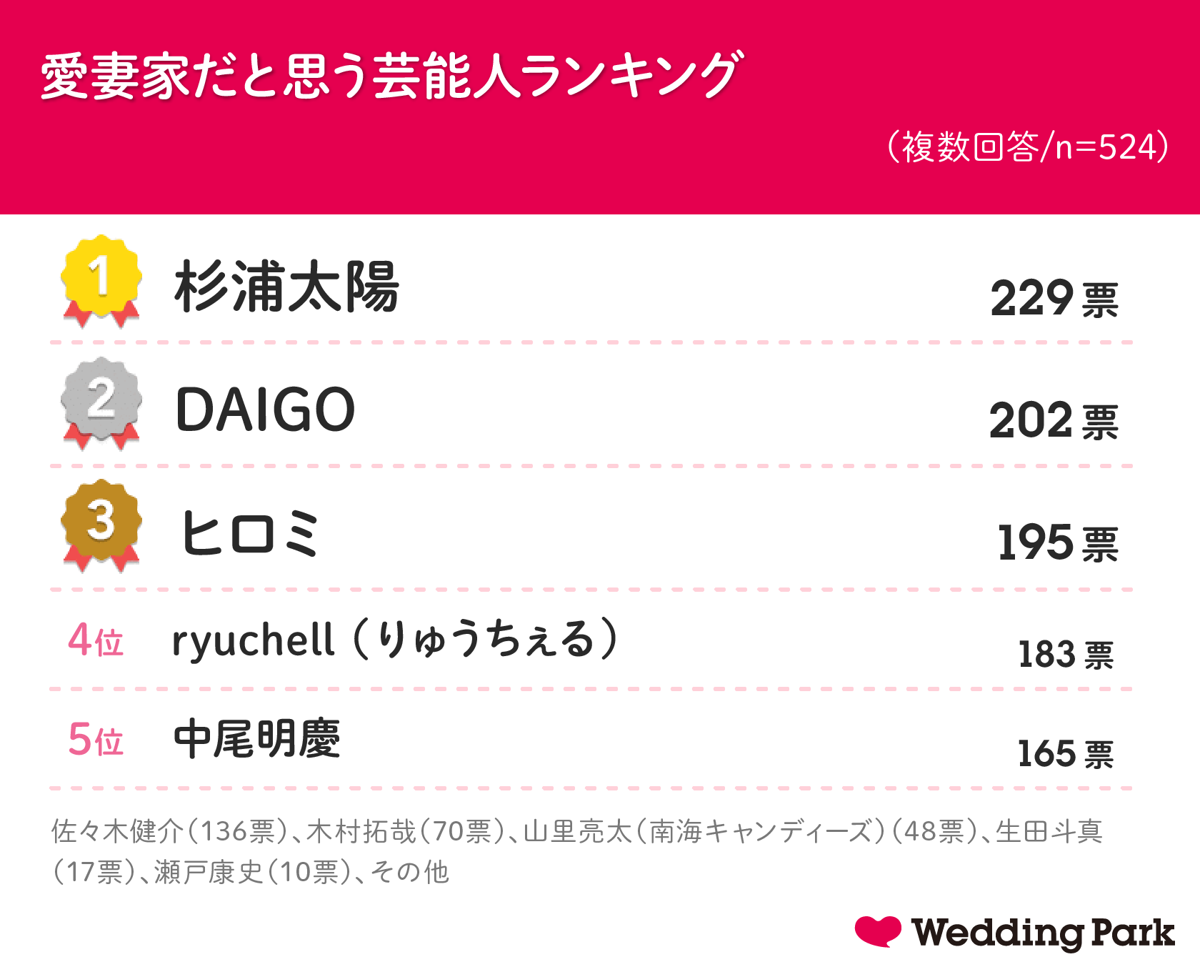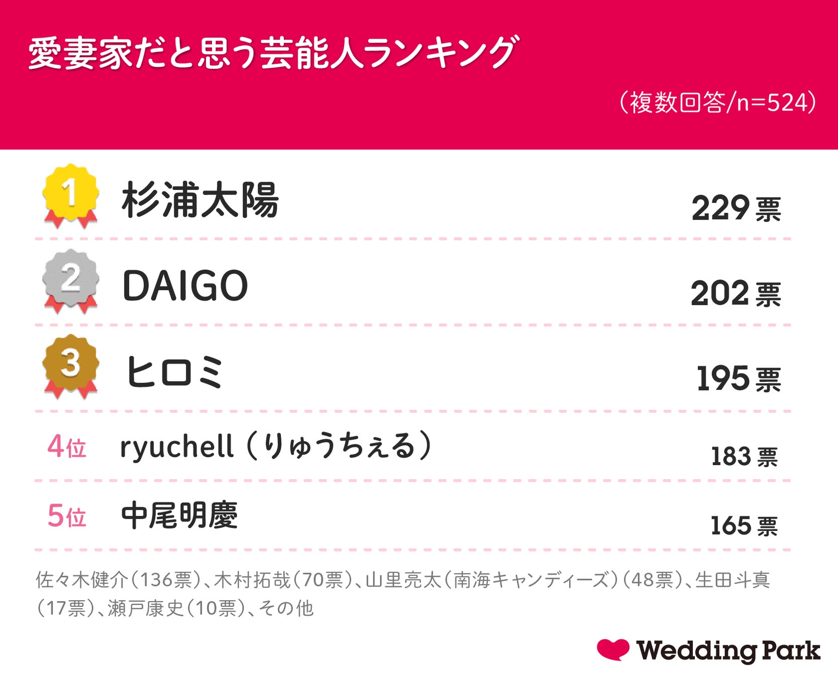 「あなたが愛妻家だと思う芸能人を教えてください(複数回答)」という質問をしたところ、1位「杉浦太陽(229票)」、2位「DAIGO(202票)」、3位「ヒロミ(195票)」という結果になりました。
