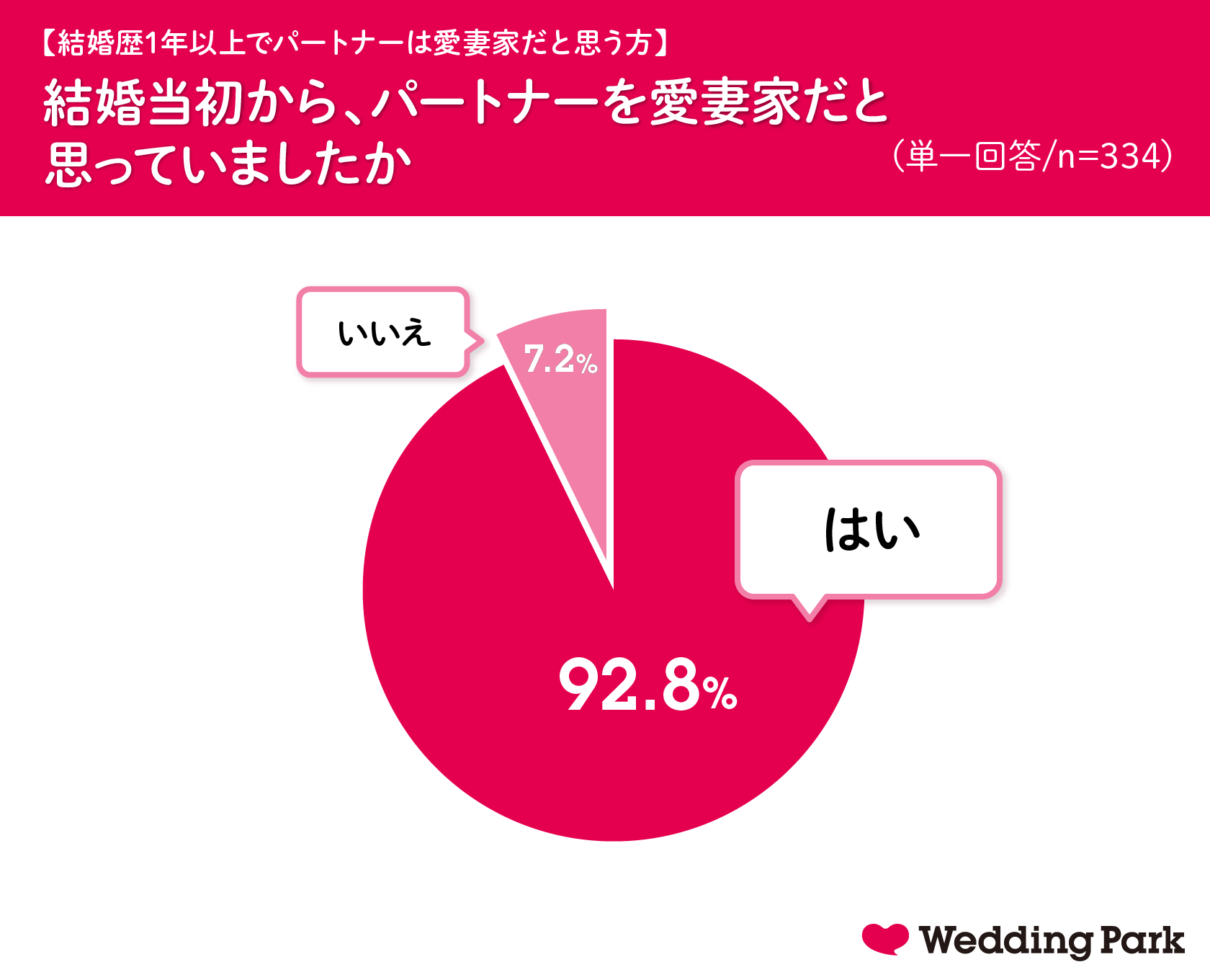「思う」、「どちらかと言えば思う」と回答した結婚歴1年以上の方に、「結婚当初から、パートナーを愛妻家だと思っていましたか(単一回答)」と質問したところ、「はい(92.8%)」「いいえ(7.2%)」という結果になり、9割以上の女性が結婚当初からパートナーを愛妻家だと思っていることがわかりました。