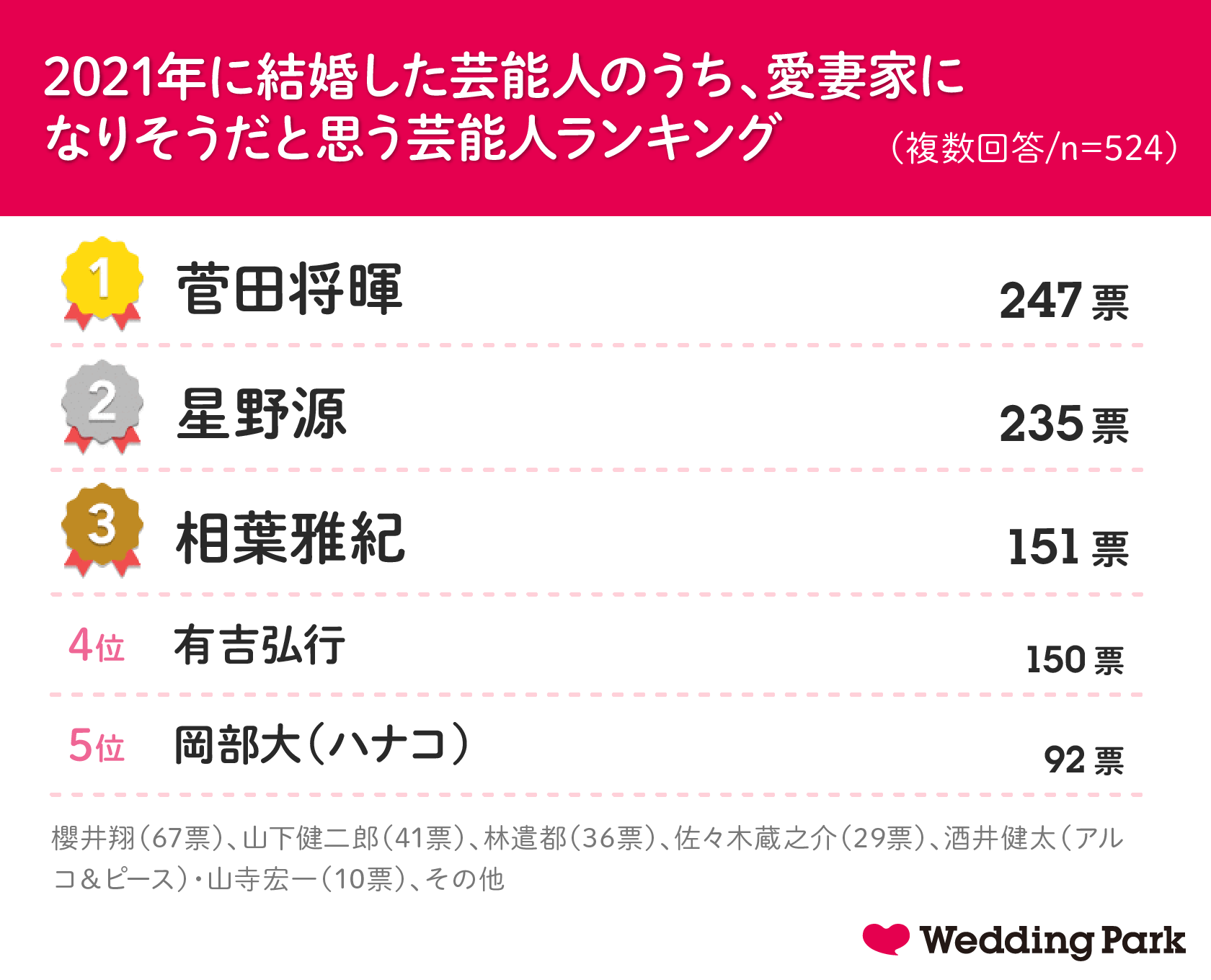また、「2021年に結婚した芸能人のうち、愛妻家になりそうだと思う芸能人を教えてください(複数回答)」という質問をしたところ、1位「菅田将暉(247票)」、2位「星野源(235票)」、3位「相葉雅紀(151票)」という結果になりました。