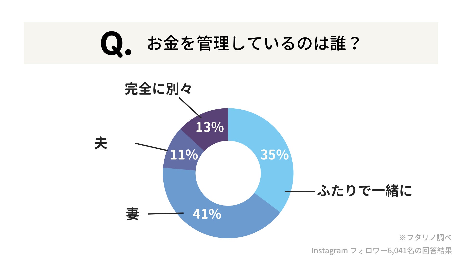 アンケートの結果、「妻がお金を管理する」と答えた夫婦が41%、「ふたりで一緒に管理する」と答えた家庭が35%という結果となりました。