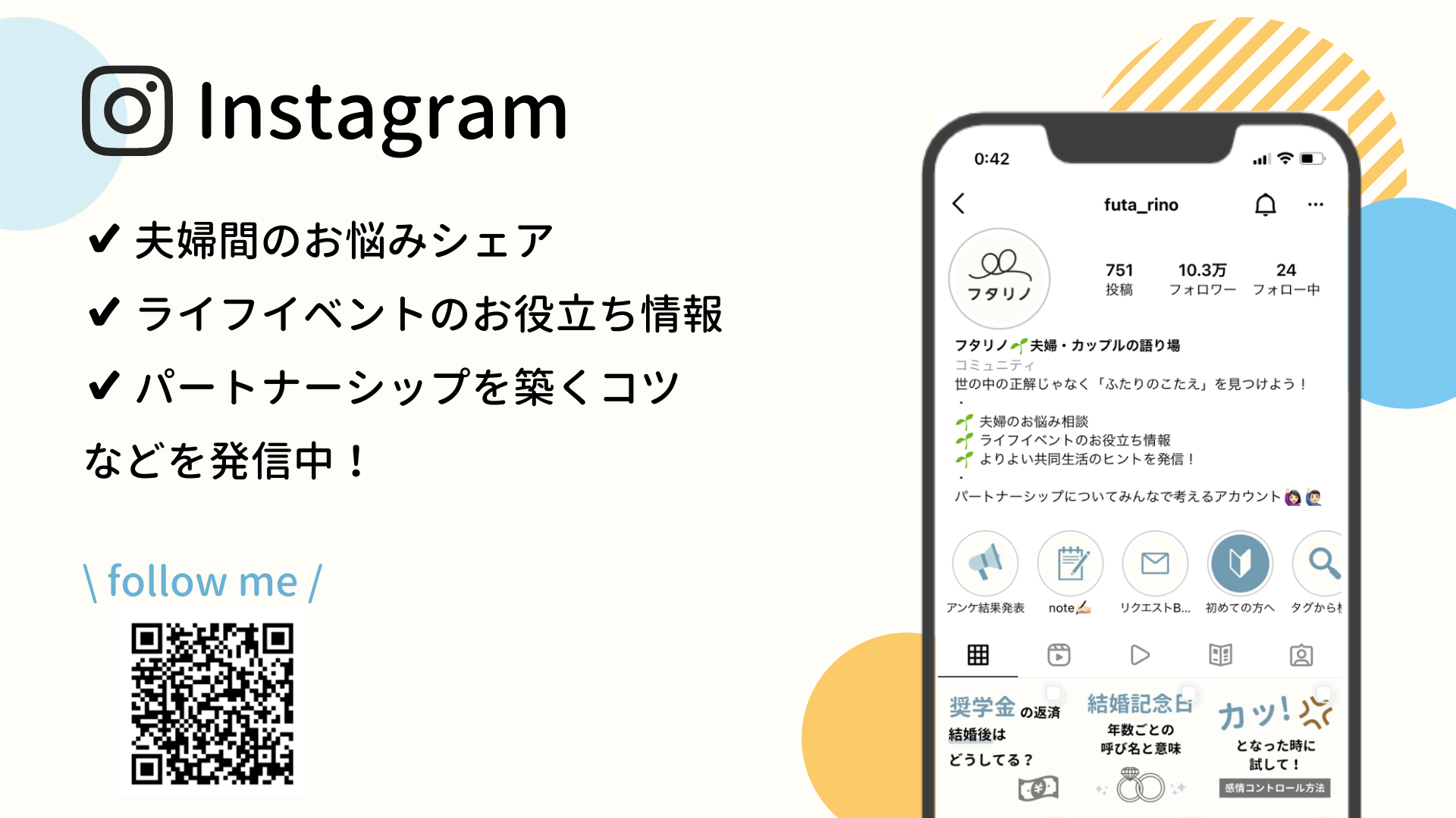 公式Instagram(フォロー無料)では、パートナーシップの構築に役立つ情報を配信しています。「みんなはこんなときどうしているのだろう?」といった、パートナーシップに関するお悩みなど、匿名でのご相談も承っています。