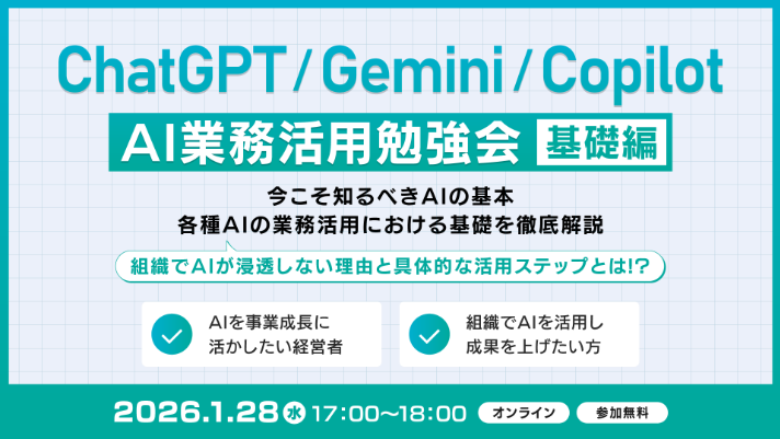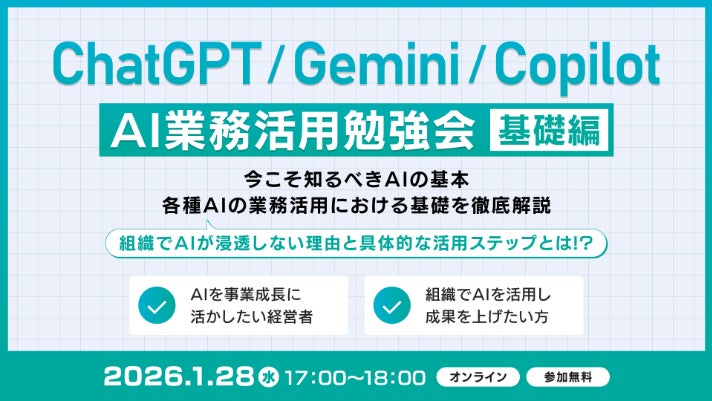 ChatGPTなどの基礎から、具体的なビジネス活用事例までを分かりやすく解説する勉強会を開催します。すでに400人以上が受講し、その効果を実感しています。ChatGPTなどの生成AIをビジネスのインフラとして活用し、業務効率化を図りたい方は、ぜひご参加ください。