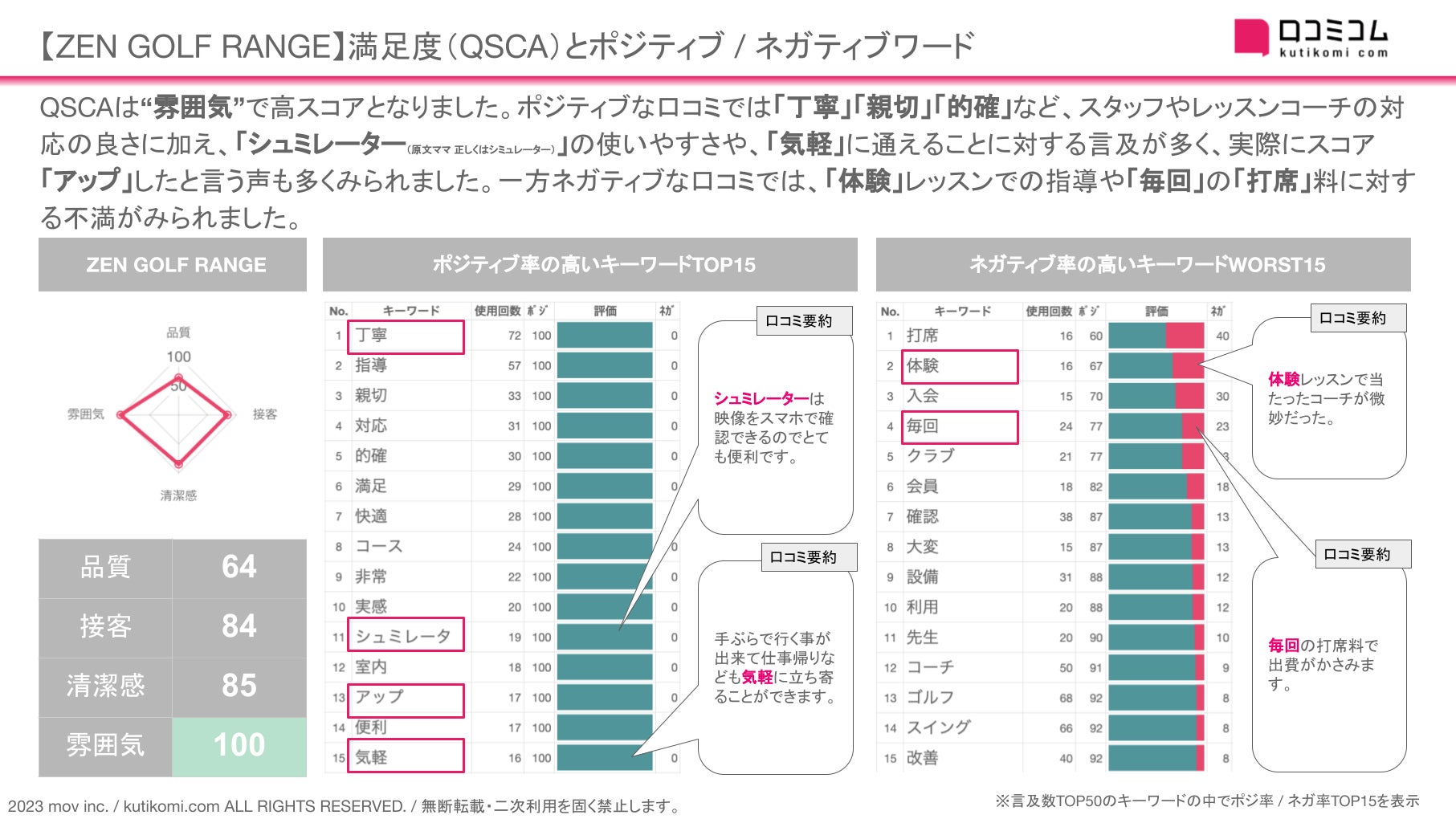 今回は、このAI解析を用いて【ZEN GOLF RANGE】 のQSCA・ポジ / ネガキーワードを確認しました。
