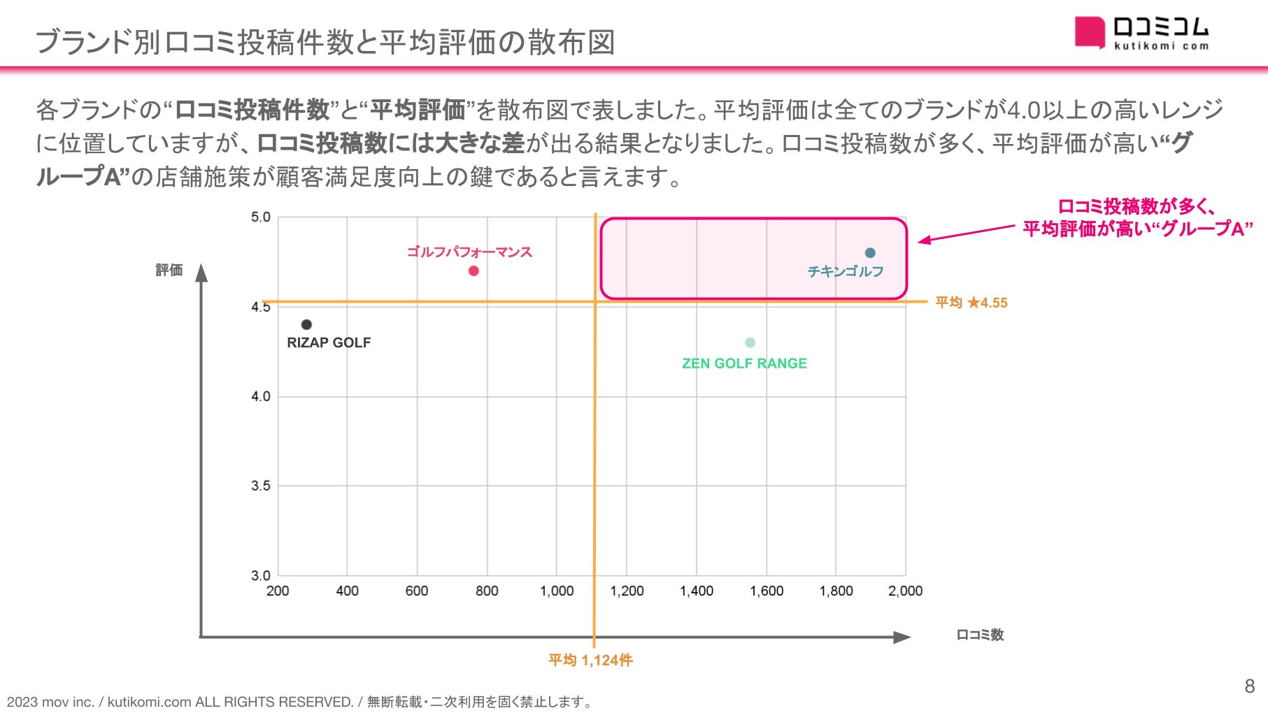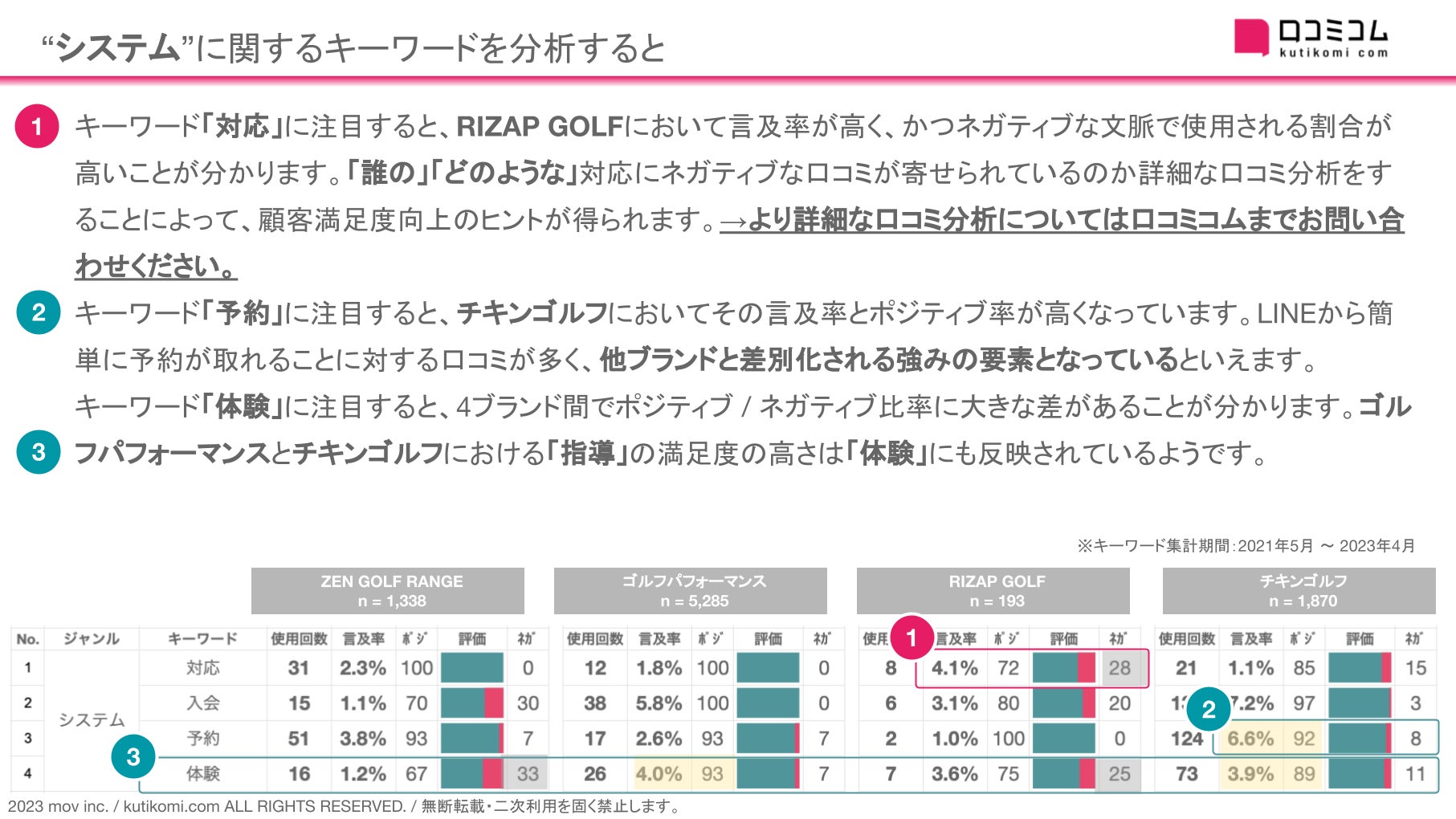 レポートでは、【ゴルフパフォーマンス】【RIZAP GOLF】【チキンゴルフ】についても同様に分析しています。ダウンロードして、是非ご確認ください。