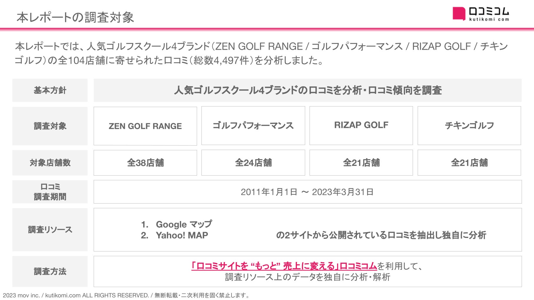 今回は、人気ゴルフスクール4ブランド(ZEN GOLF RANGE / ゴルフパフォーマンス / RIZAP GOLF / チキンゴルフ)の口コミ(総数4,497件)を分析しました。