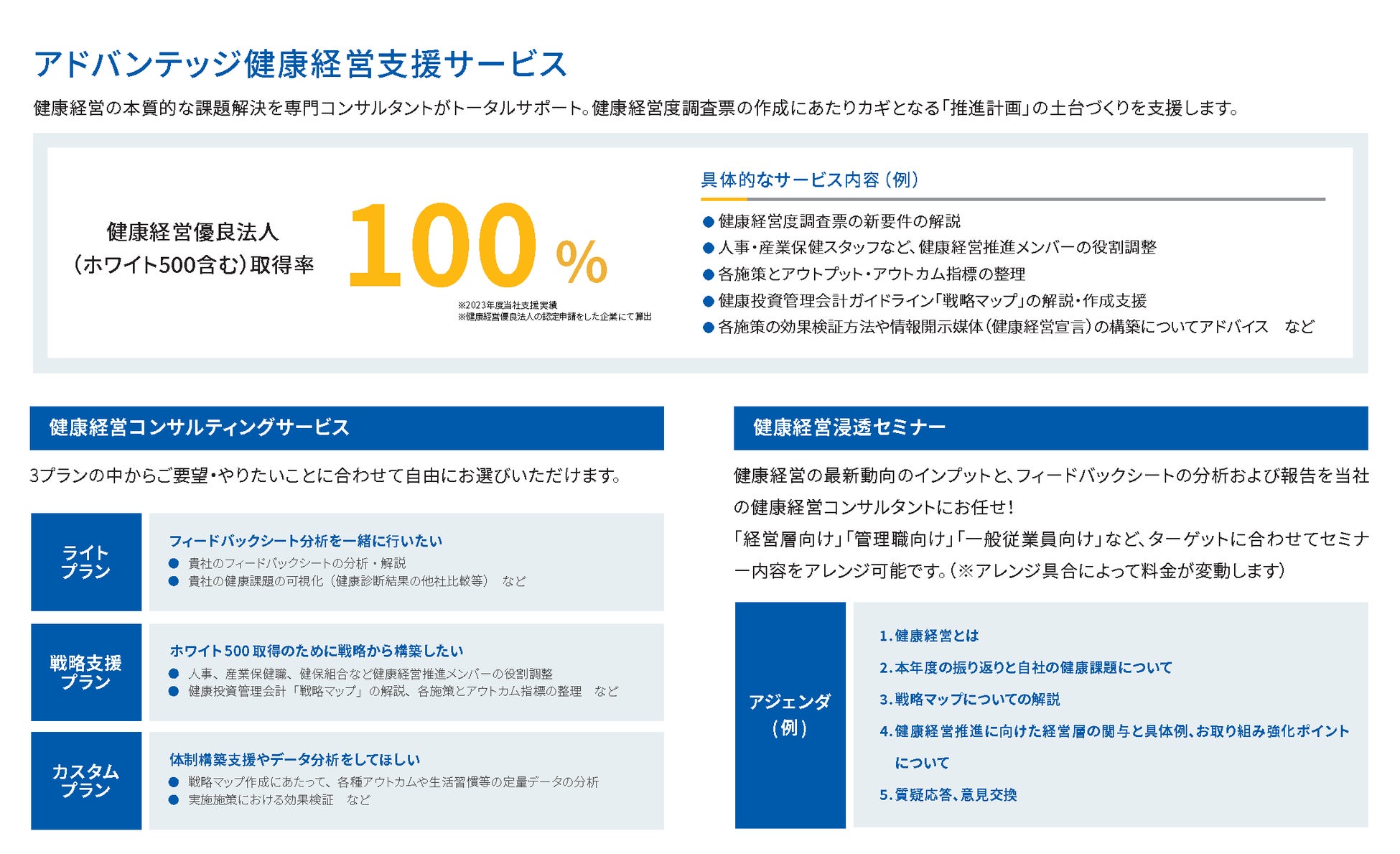 「アドバンテッジ健康経営支援サービス」は、健康経営度調査票の解説や、企業の取り組みにおける推進体系・プロセス評価、健康課題対策の戦略支援を行うコンサルティングサービスです。「健康経営エキスパートアドバイザー」保有者のコンサルタントが専門的知見のもと、支援を行っています。また課題のフェーズ別に対応した「健康経営コンサルティングサービス」や、最新情報のインプットやフィードバックシートの分析・および報告を行う「健康経営浸透セミナー」など、企業の健康経営推進に伴走するサービスを展開しています。