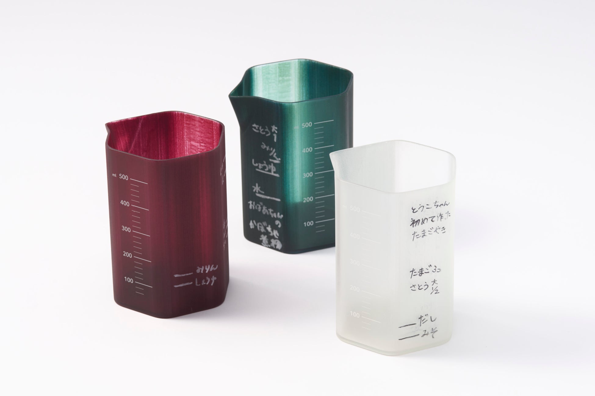 オリジナルの目盛りをメモできるビーカーです。六角柱型のビーカーの側面にフロスト加工が施されており、マジックペンで書き込むことができます。時に感覚に頼る調味料の配合を記すことで、親子の関係を、家庭の味を、もう会えないあの人の味を思い出し、つないでいきます。