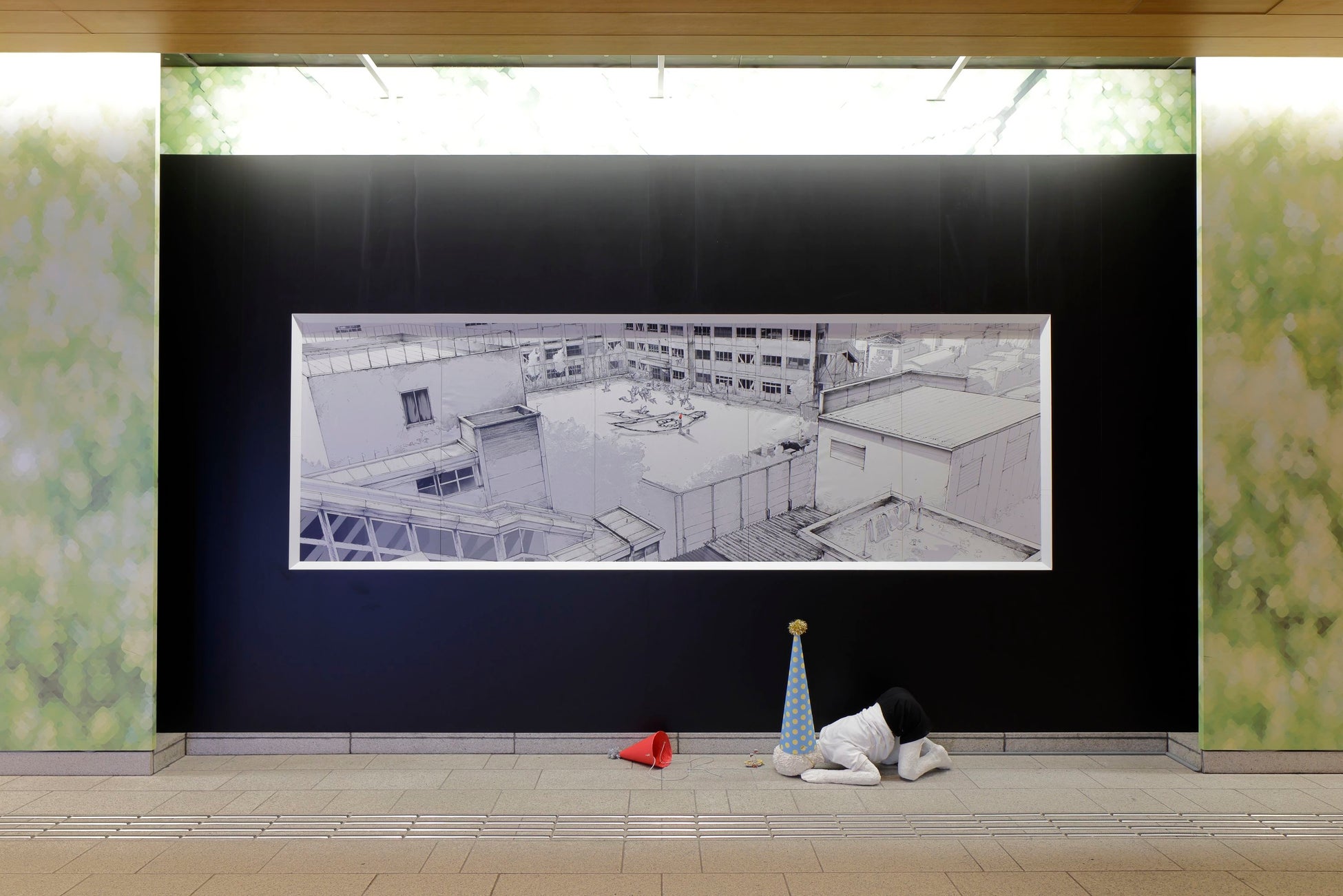 マンガの制作技法で、言葉から解放された物語を経験してもらうような作品を目標としてきた。連絡通路の真ん中に寝ている子供。近寄ると呼吸していることが見てとれる。その隣に、絵の中の子供と同じ誕生日の帽子が落ちている。それは絵と何か関連があるのだろうか。疑問から始まる言葉のない物語。過去と現在、現実空間と架空の世界、静と動、懐かしさとちょっとした違和感、没入感と疎遠感。様々な時空を往還しながら多様な解釈を想像できる空間に挑んだ。
