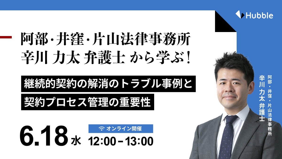 契約業務・管理クラウドサービス「Hubble(ハブル)」を提供する株式会社Hubble(東京都渋谷区、CEO:早川 晋平)は、2025年6月18日(水)に、「継続的契約の解消のトラブル事例と契約プロセス管理の重要性」をテーマとしたオンラインセミナーを開催します。本セミナーでは、継続的契約の終了局面で起きやすいトラブル事例や、契約プロセス管理の実務ポイントについて、実務経験豊富な弁護士が解説します。
