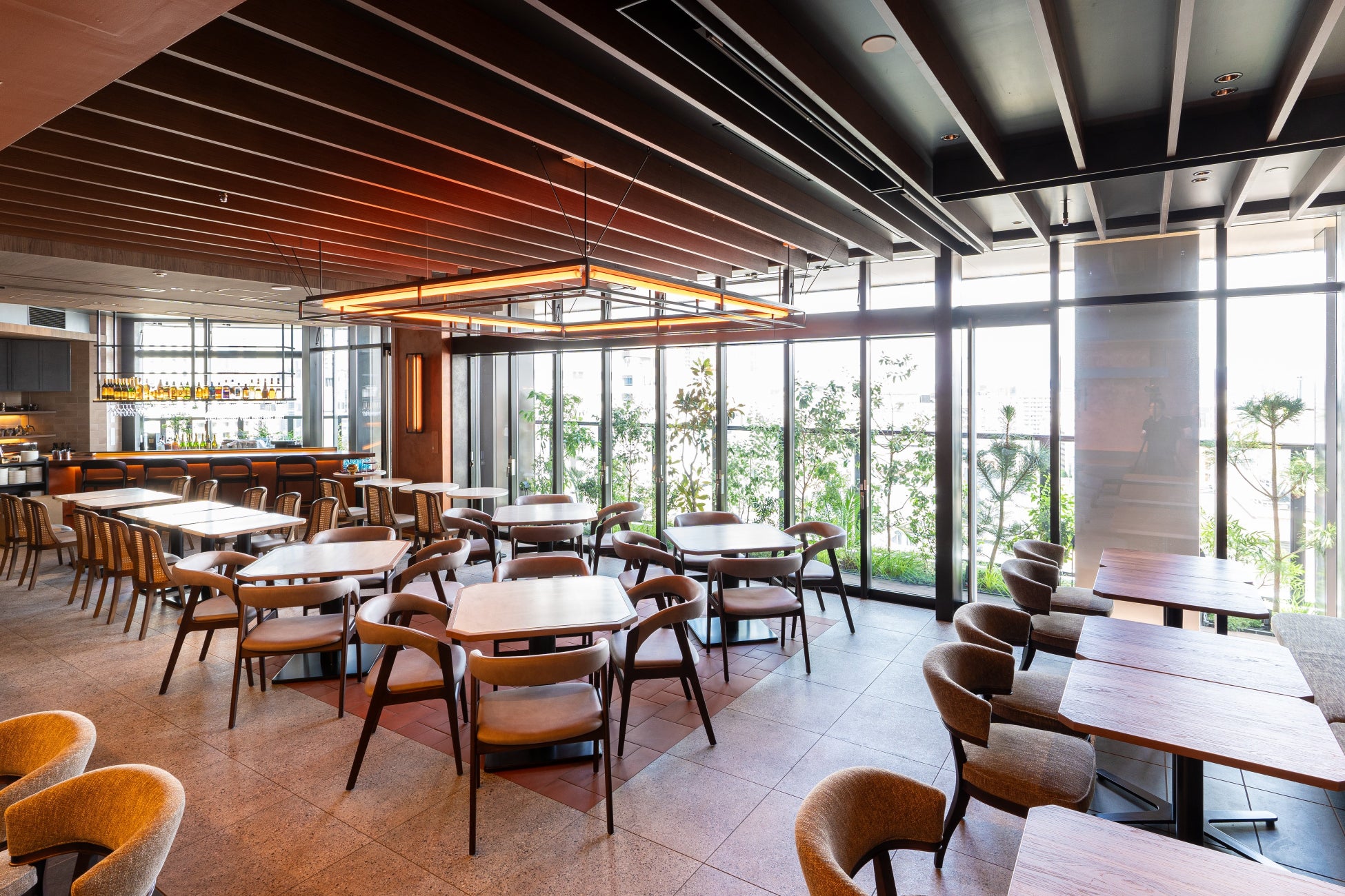 晴海通りに面した1階のロビーには、グリーンの専門家がこだわって選定した2本のシンボルツリーを配置し、吹き抜けた高い天井に合わせて上部にも様々なグリーンが自然と視界に入るようデザインすることで、開放的な空間に自然の癒しをご提供します。さらに、光がやわらかく差し込む天高約6mの2層吹き抜けガラス面には、多彩な植栽を施し三井ガーデンホテルズのブランドタグラインである「Stay in the Garden 」を表現しています。都会のOASISのように想いのままくつろげる空間に仕上げました。