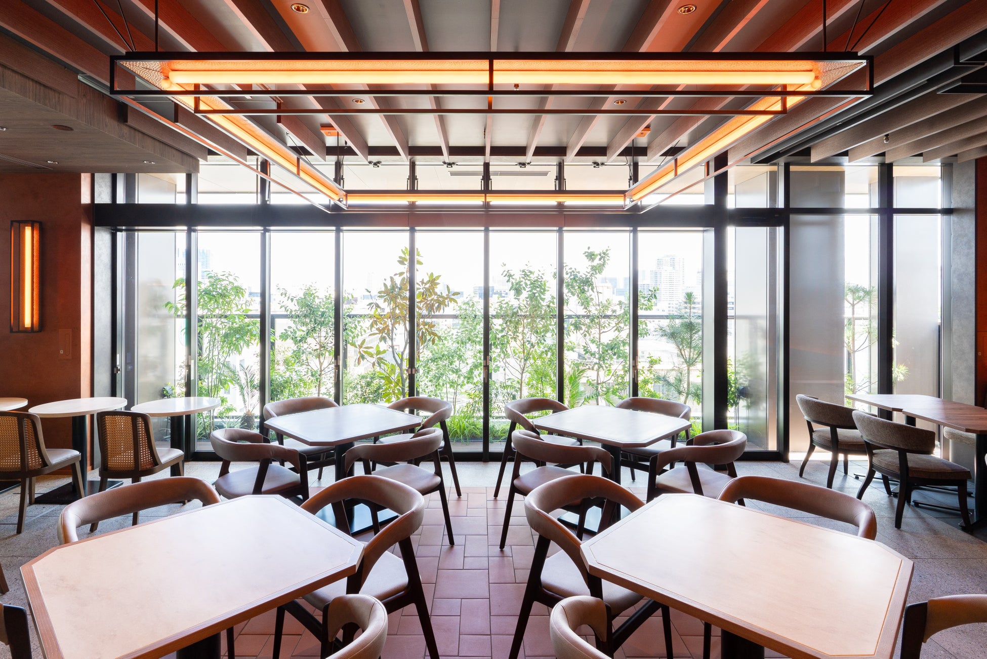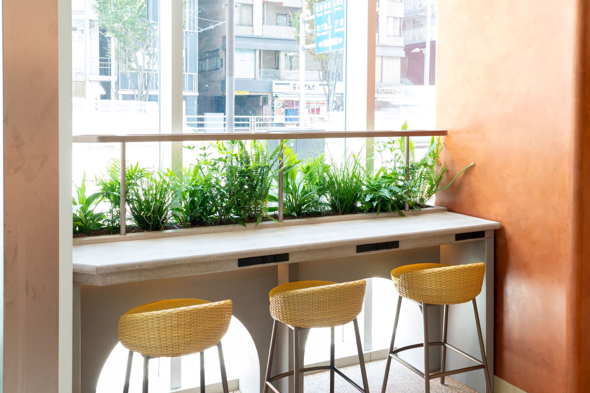 最上階の14階にあるレストランのテラスにも緑豊かに植栽を設置しました。多様な人々が訪れにぎわう銀座や築地のように多種多様な植物を専門のスタッフがセレクトしデザインしています。