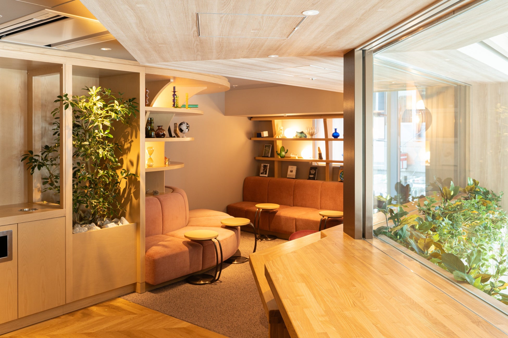 2階にあるリフレッシュスペースは「TREE HOUSE」をイメージしており、ロビーのグリーンを眺めながらゆっくりくつろげる空間となっています。大き目のグリーンをポイントに置くことでさらに癒しのスペースとなっています。