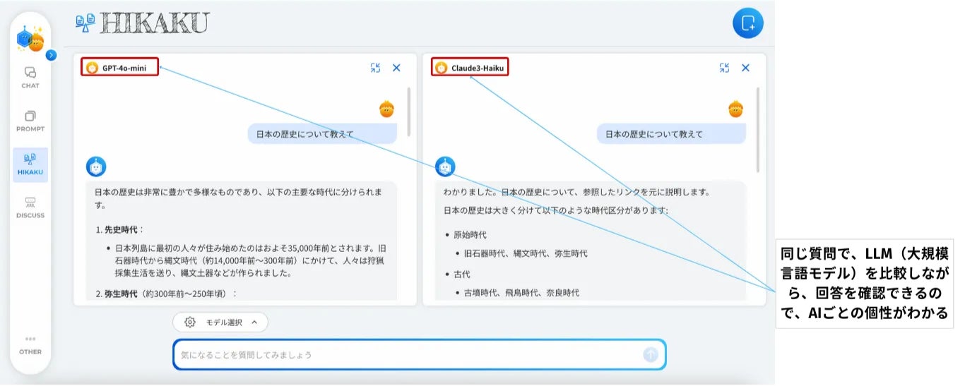 同じプロンプトでも、LLMによって回答が異なります。この比較機能を使えば、複数のLLMの回答を並べて比較することが可能です。児童・生徒は、それぞれのAIの特性や得意分野を理解し、「なぜ答えが違うのか」「自分の目的に合ったAIはどれか」を考える力を養うことができます。