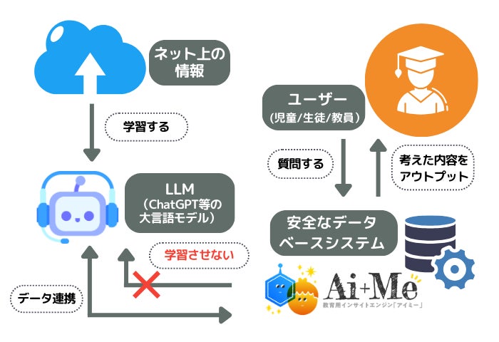 利用データは外部に送信されない独自設計。機密情報や個人情報がAIの学習データに使われる心配がなく、学校内で安心して利用できます。