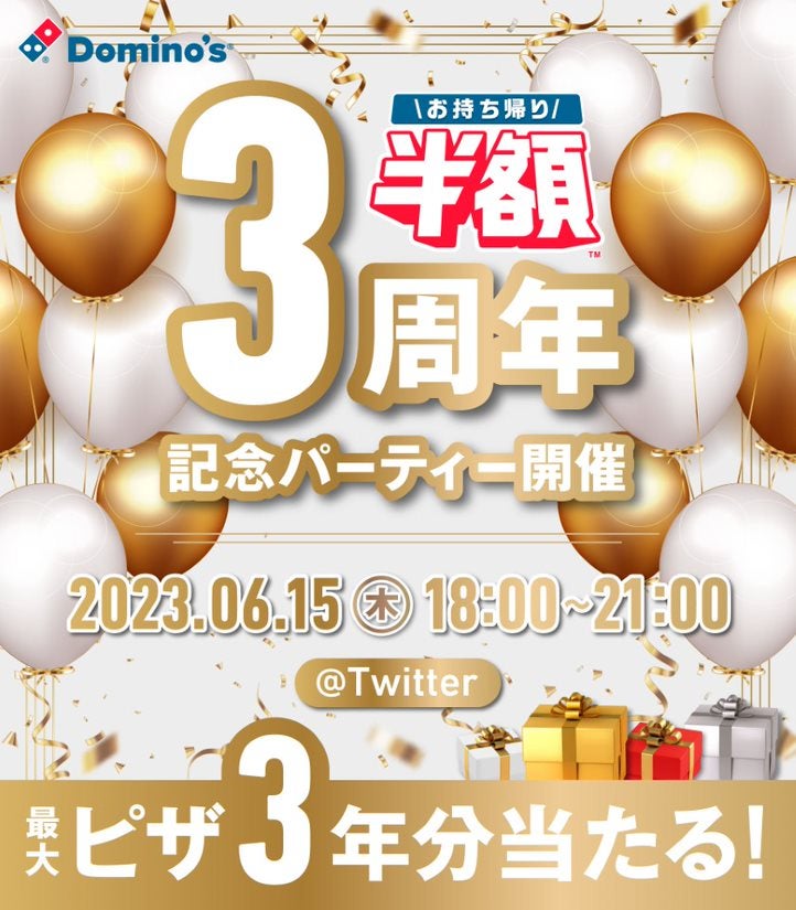 ドミノ・ピザ、大ヒット「お持ち帰り半額TM」が6月15日で発売3周年 絶対1万人以上に「おめでとう」と祝ってほしい! 「『お持ち帰り半額TM』祝3歳!Twitterキャンペーン」開催!