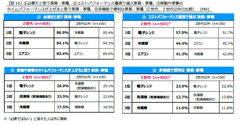 ②「コスパで選ぶ家具・家電」でもトップ3項目は同様となり、必要なものをしっかりとコスパを見極めて購入している様子がうかがえます。③「移動や家事のタイパが上がると思う家具・家電」④「多機能で便利な家具・家電」では、「電子レンジ」「洗濯機(乾燥機能あり)」「冷蔵庫」がトップ3となりました。Z世代以外では、タイパが上がる家電の1位は「洗濯機(乾燥機能あり)」で、洗濯における時短や手間の短縮がより支持されているようです。