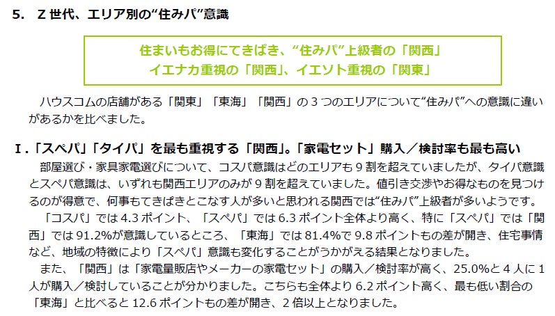 ハウスコムでは、部屋選びや家具家電選びにおいて、住まいの効率のよさを意識する新しい価値観を「住まいパフォーマンス(略して“住みパ”)」と定義し分析したところ、Z世代では8割以上が“住みパ”を重視しており、他の世代に比べて高い割合であることが分かりました。その他、“住みパ”を高めるために活用している家電についてや、関東・関西・東海での“住みパ”意識の比較など、様々な切り口から“住みパ”に関するデータをまとめました。