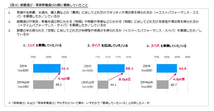 2)Z世代の「部屋選び・家具家電選び」調査からは、かけた費用に対する効果など、「お金・時間・空間」の効率を追求する意識が特に高く、若者の部屋探しの3大要素は「コスパ」「タイパ」「スペパ」と言い切れる結果となりました。特に、コスパへの意識は92.5%と顕著で、好きなものにお金や時間を惜しみなく投資する一方で、無駄なものにコストをかけることは回避したい思いが他世代より強く、「失敗したくない意識」の表れだと推測しています。