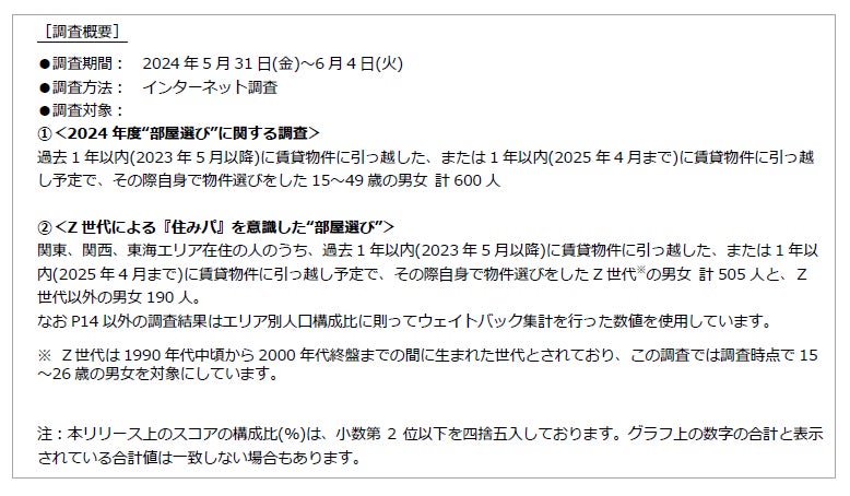 関東、関西、東海エリアに在住の人のうち、1年以内(2023年5月以降)に、自身で部屋選びをして「賃貸物件」に引っ越しをした、または今後1年以内(2025年4月まで)に引っ越す予定の、Z世代の男女505人と27~49歳の男女190人を対象に、部屋選び・家具家電選びの際に意識することに関する調査を行いました。