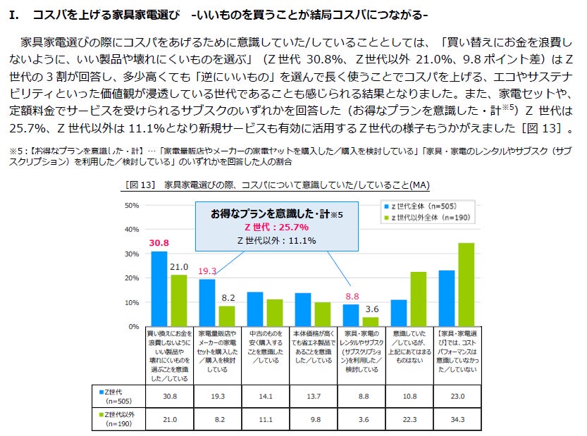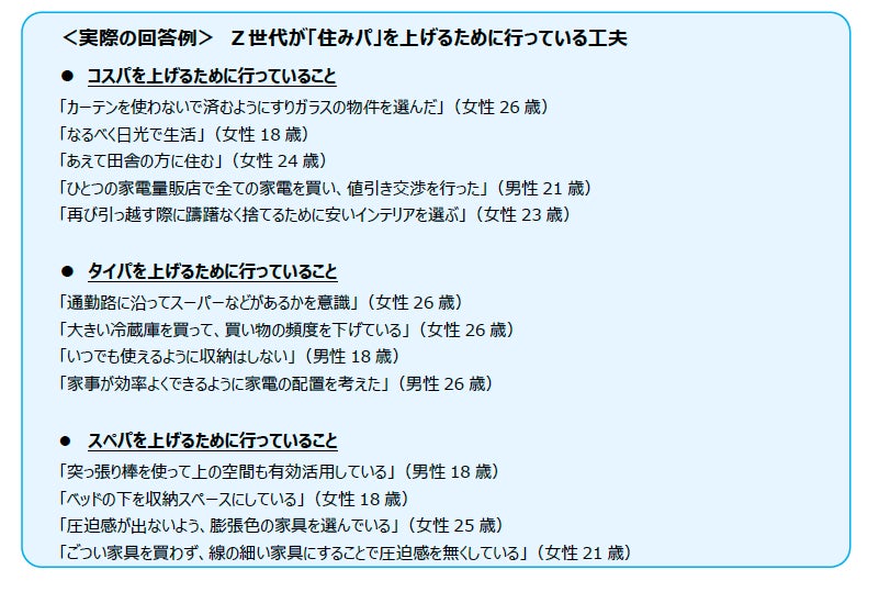 Z世代が「住みパ」を上げるために行っている工夫を自由回答で聞いてみると、コスパを上げるために、「なるべく日光で生活」(女性18歳)などの光熱費を抑える方法や、「ひとつの家電量販店で全ての家電を買い、値引き交渉を行った」(男性21歳)のような、まとめ買いでお得に購入をしている様子も見られました。