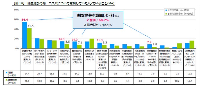 ※1:【割安物件を意識した・計】…「家賃相場が安い(穴場)エリアを意識した/している」「相場より安く住むためにリノベーション物件を見た/見ている」「費用節約のため家具・家電付き物件を見た/見ている」「光熱費節約のためソーラーパネル付オール電化物件を見た/見ている」のいずれかを回答した人の割合