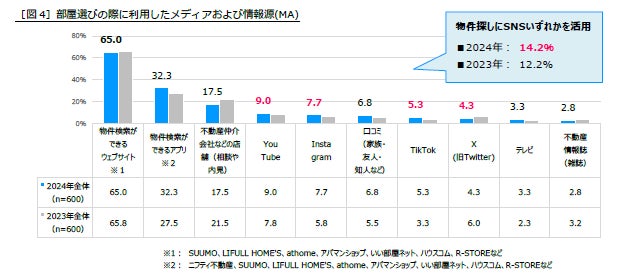 部屋選びの際に利用したメディアや情報源について聞くと、「物件検索ができるウェブサイト※1」(65.0%)が圧倒的1位となりました。続いて「物件検索ができるアプリ※2」(32.3%)、「不動産仲介会社などの店舗(相談や内見)」(17.5%)がトップ3項目となりました。「物件検索ができるアプリ」は昨年より4.8ポイント増加しており、アプリ機能の充実などで利用者が増えていると考えられます。