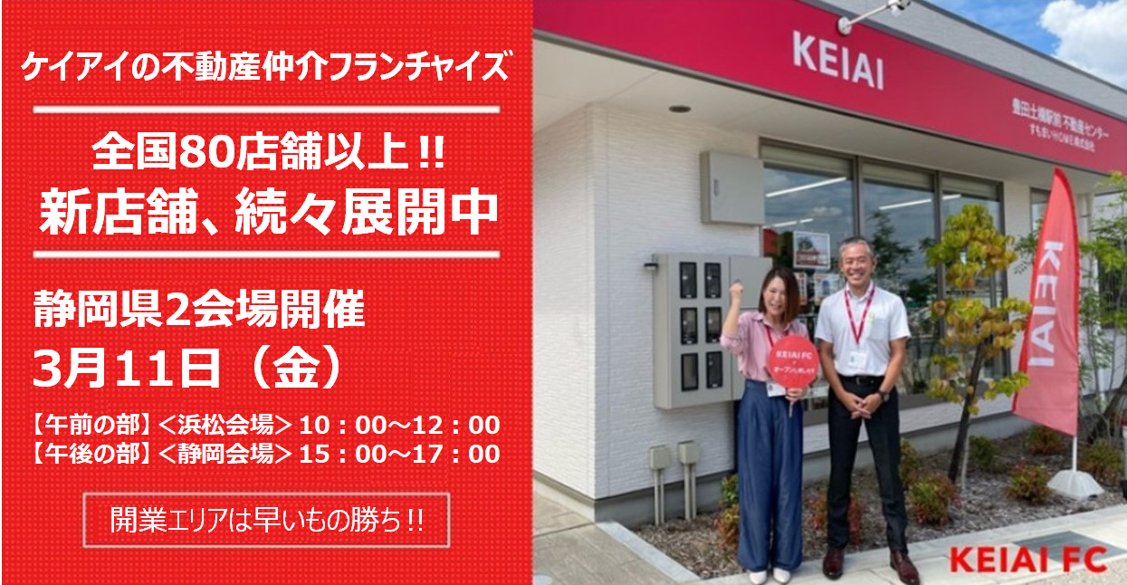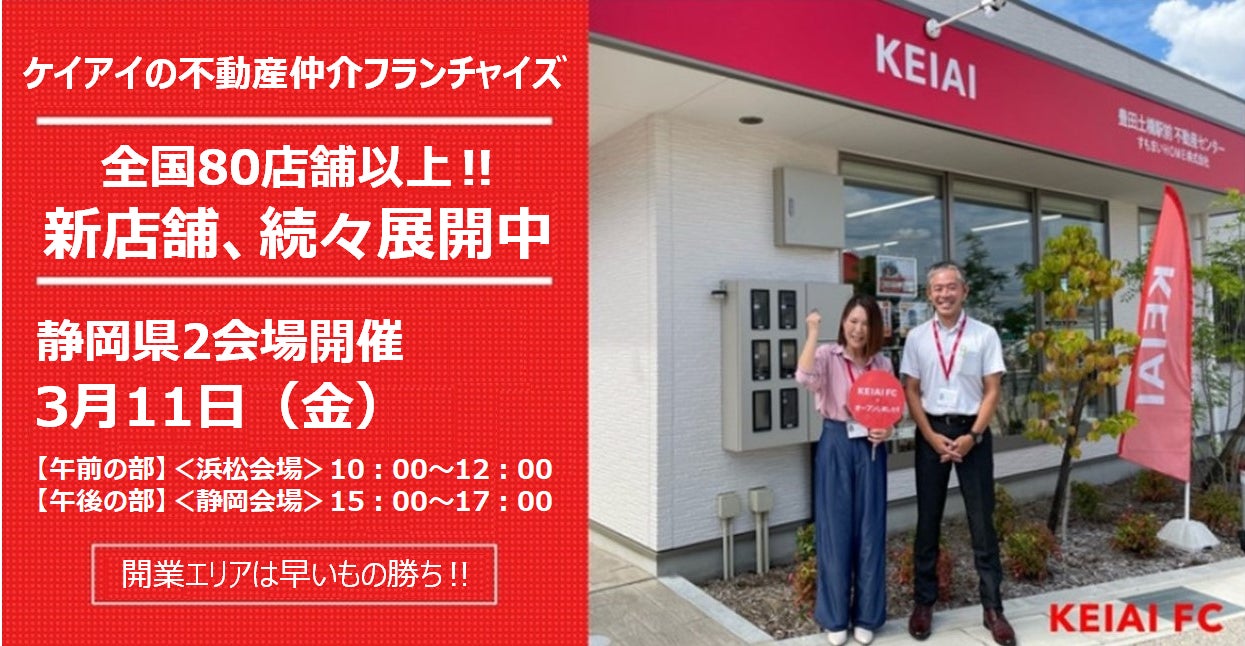 ケイアイスター不動産株式会社(本社/埼玉県本庄市、代表取締役/塙 圭二、以下「当社」と言う。)のグループ会社ケイアイネットクラウド株式会社(本社/東京都千代田区、代表取締役/真杉 恵美、以下「ケイアイネットクラウド」と言う。)は、フランチャイズ事業「KEIAI FC(ケイアイ エフシー)」(以下「KEIAI FC」と言う。)において、フランチャイズへの加盟や不動産業の開業を検討している方に向け、【経験あるなし関係なし!「勝ち組不動産会社になるための必勝戦略セミナー」】(以下「本セミナー」と言う。)を2022年3月11日(金)に静岡県にて開催いたします。今回は午前と午後に分け、浜松市と静岡市の2つの会場をご用意しております。