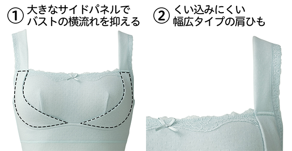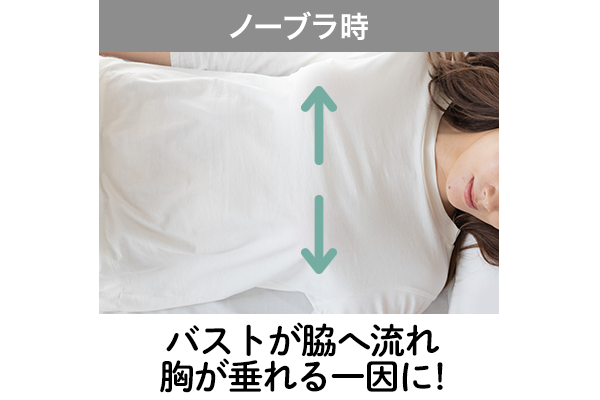 人は寝ている間に何度も寝返りを打つので、そのたびにバストは揺れ動き、くずれや下垂の一因となります。いつまでも若々しいバストをキープするためには、横流れを防いで形を整えるナイトブラがおすすめです。