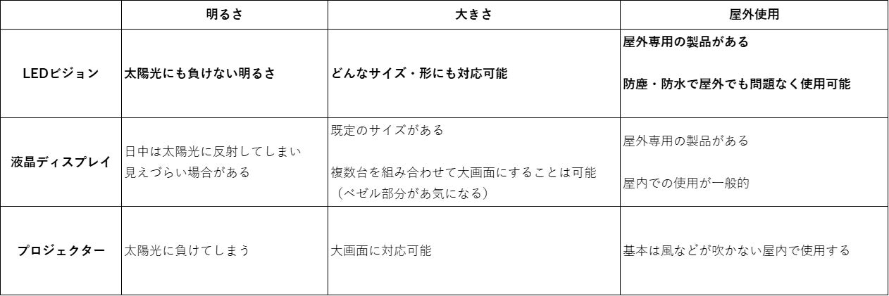 LEDビジョンは液晶ディスプレイやプロジェクターといった映像表示機器の中でも屋外での使用に適しています。