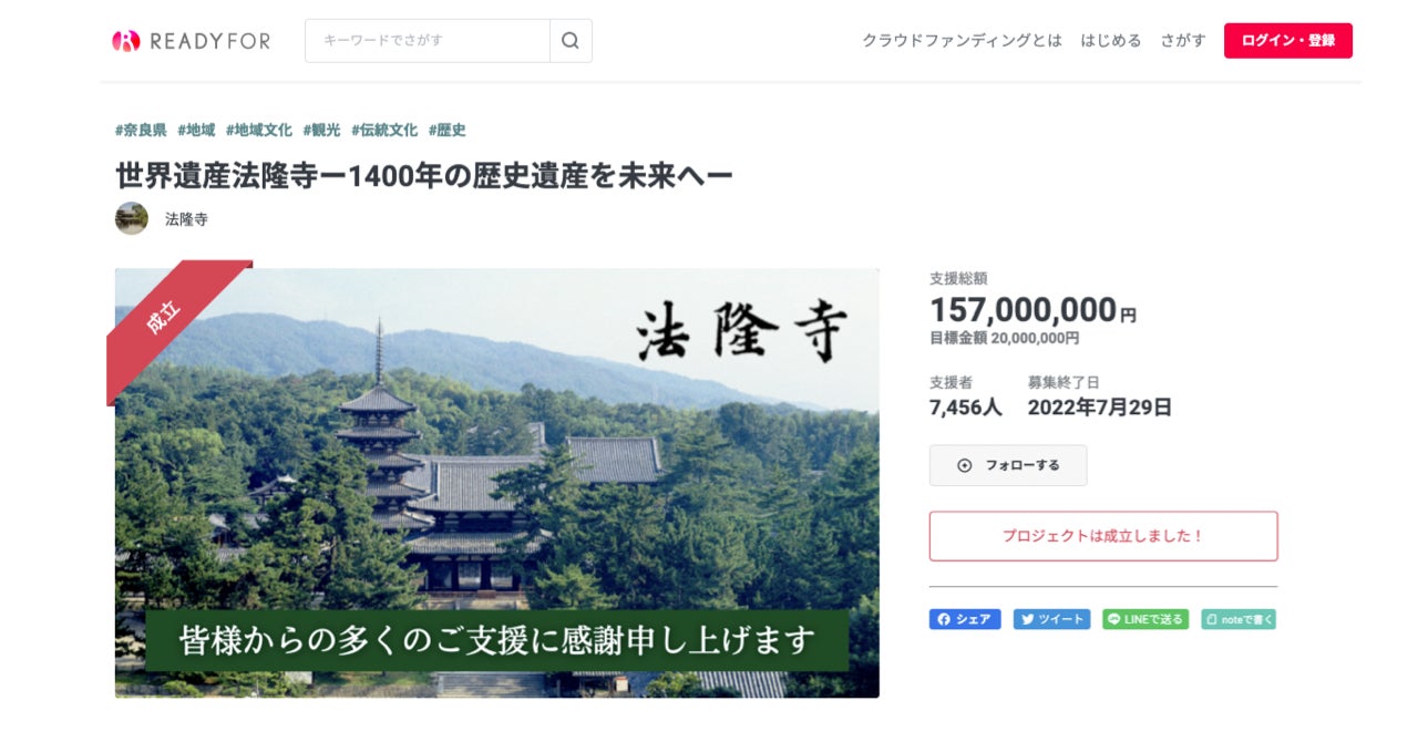 READYFOR株式会社(所在地:東京都千代田区、代表取締役:米良はるか)が運営する日本初・国内最大級のクラウドファンディングサービス「READYFOR」にて公開されていた世界遺産法隆寺によるプロジェクト「世界遺産法隆寺ー1400年の歴史遺産を未来へー」が、目標達成率785%、7456名から157,000,000円の支援を集めました。