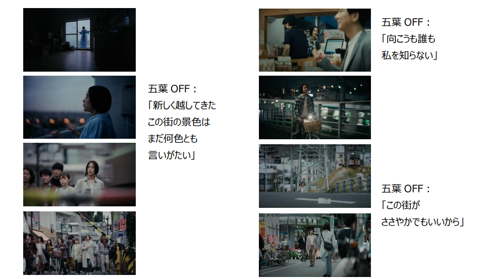 一番の見どころは、五葉が訪れるカフェや牛丼屋、ファミレスで、南波家の南波さん(鈴木京香さん)、旦那くん(飯塚悟志さん)、次女(古川琴音さん)とニアミスするシーンです。偶然その場に居合わせたり、目が合ったりしただけで、まだお互いの存在すら知らない五葉と南波家の人々の人生が、さまざまな形で交錯しながら展開していく新CMシリーズにご注目ください。
